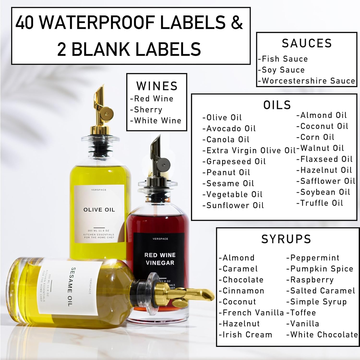 Olive Oil Dispenser Bottle For Kitchen With Silicone Tray & 40 Labels, Soy Sauce Dispenser, Coffee Syrup Dispenser, Olive Oil Bottles Set Of 2, Gold