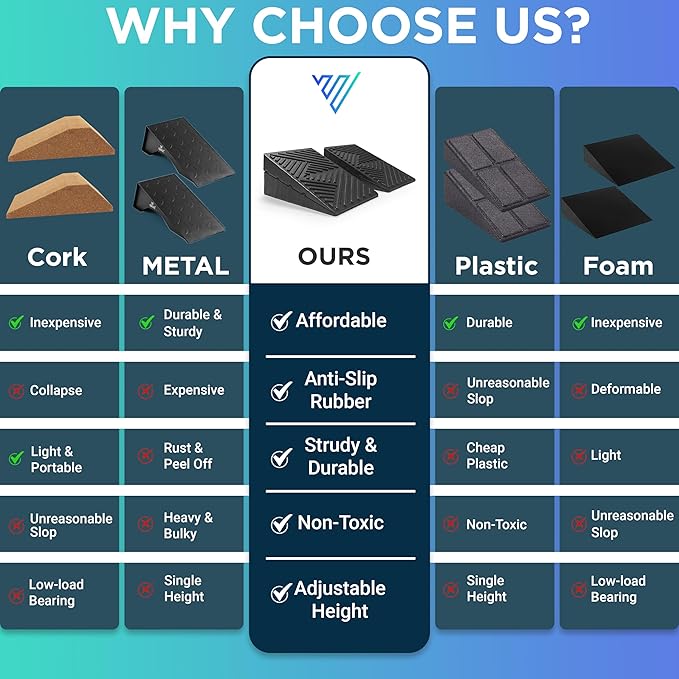 • 💪 4PCS adjustable slant board system includes four rubber wedges to create 3 incline levels (9°, 13°, 22°) for strength, flexibility, and squat depth. Works as a heel elevated squat wedge, squat wedge board, or calf raise block to improve dorsiflexion and lower-body mechanics.
