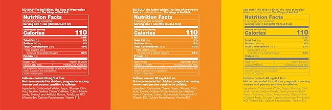 • This Variety Pack includes 8 cans each of Watermelon, Strawberry Apricot, and Tropical; Red Bull features taurine, an amino acid, plus four essential B-group vitamins B3, B6, B12 and B5, which contribute to normal energy-yielding metabolism