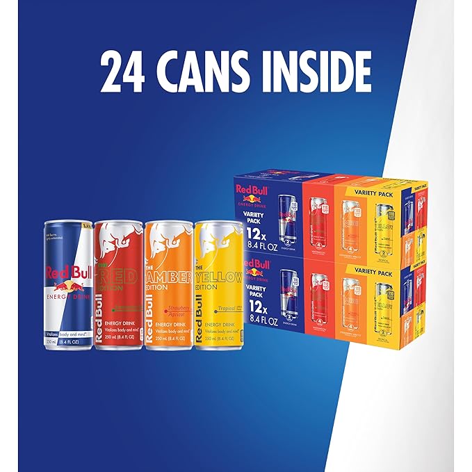 Red Bull Energy Drink Variety Pack, Red, Yellow & Amber, with 80mg Caffeine plus Taurine & B Vitamins, 8.4 Fl Oz, Pack of 24 Cans