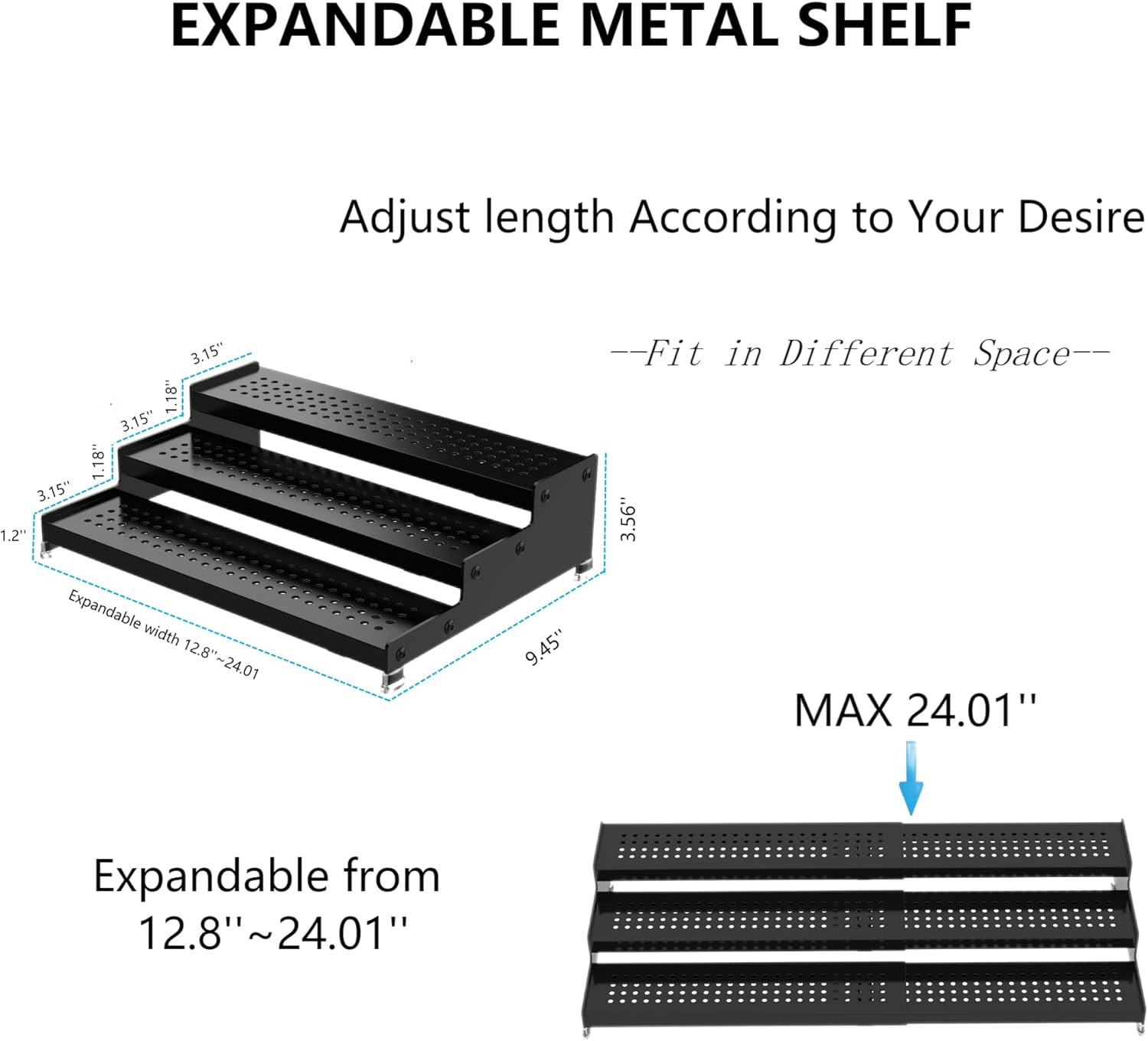 - ⭐[Expandable]The width of spice rack can be expandable from 12.8 to 24.01 inches which can be adjusted according to your needs to effectively utilize your storage space. It is save storage solution for spice jars.