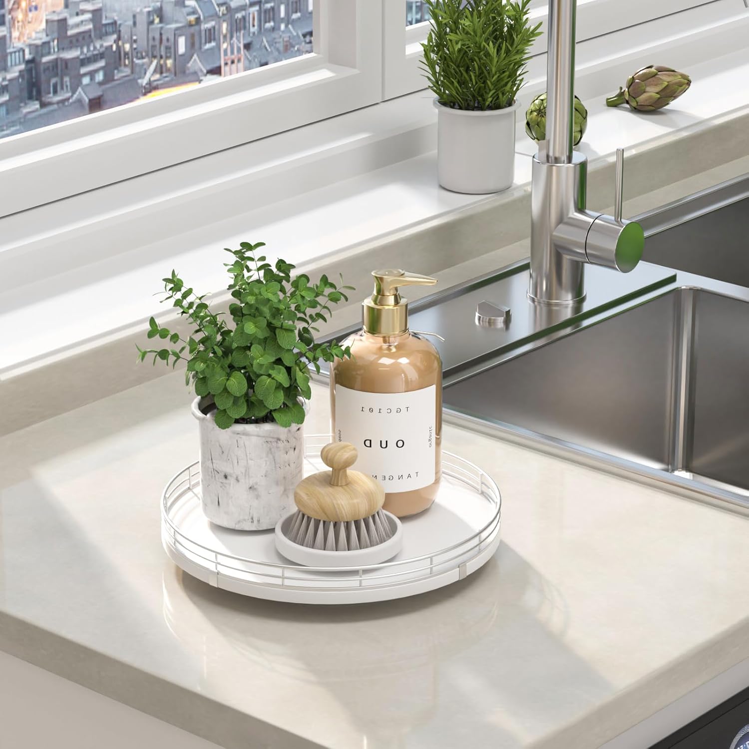- ๐ง๐ต๐ผ๐๐ด๐ต๐๐ณ๐๐น ๐๐ฒ๐๐ถ๐ด๐ป: The turntable tray features a smooth and silent 360ยฐrotation; Bottom slip-resistant pads for stability and protect your countertop from scratches; Raised edges on each organizer tray to keep items from falling out; Easy to use, no installation required