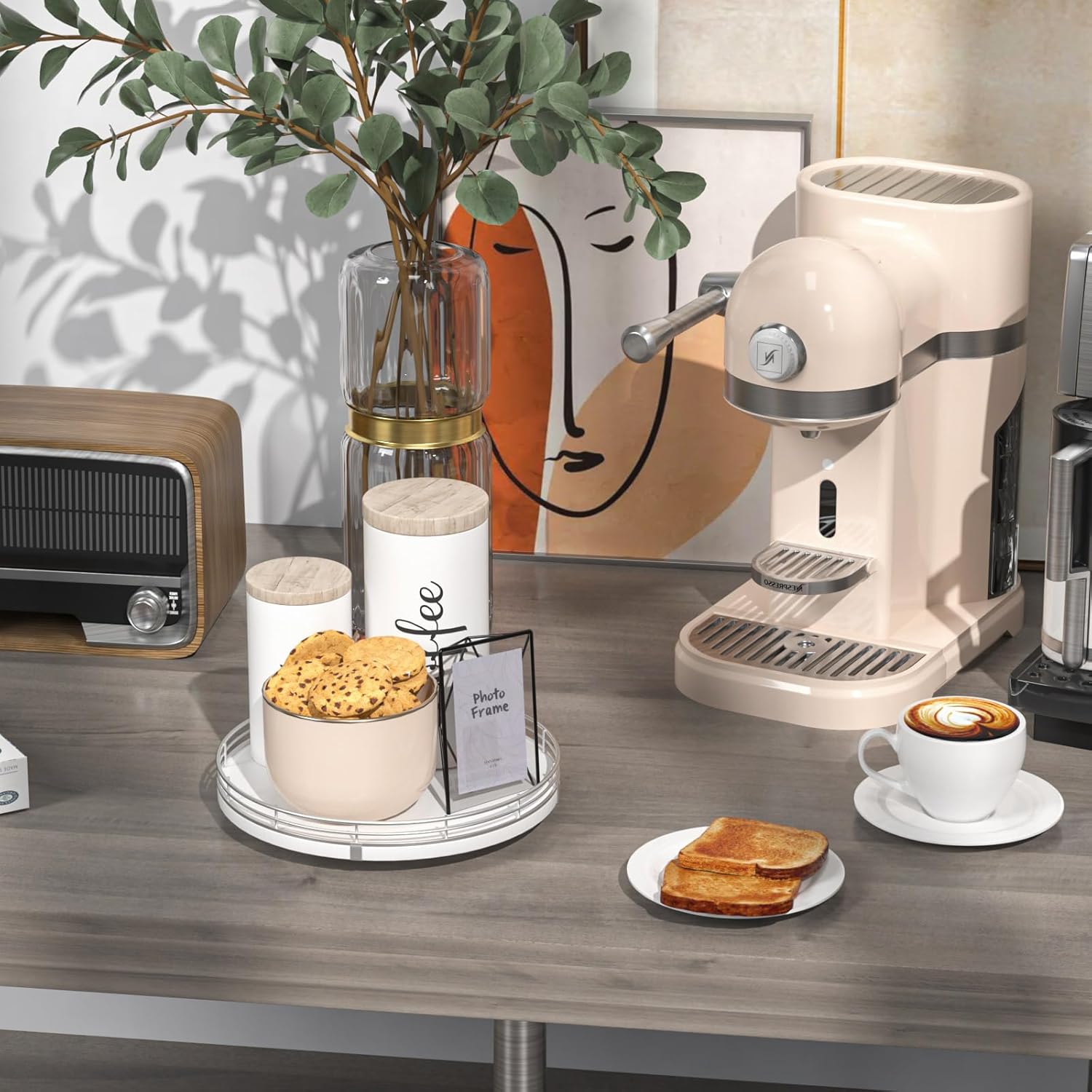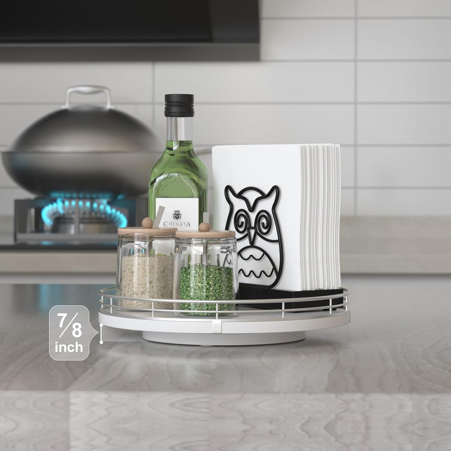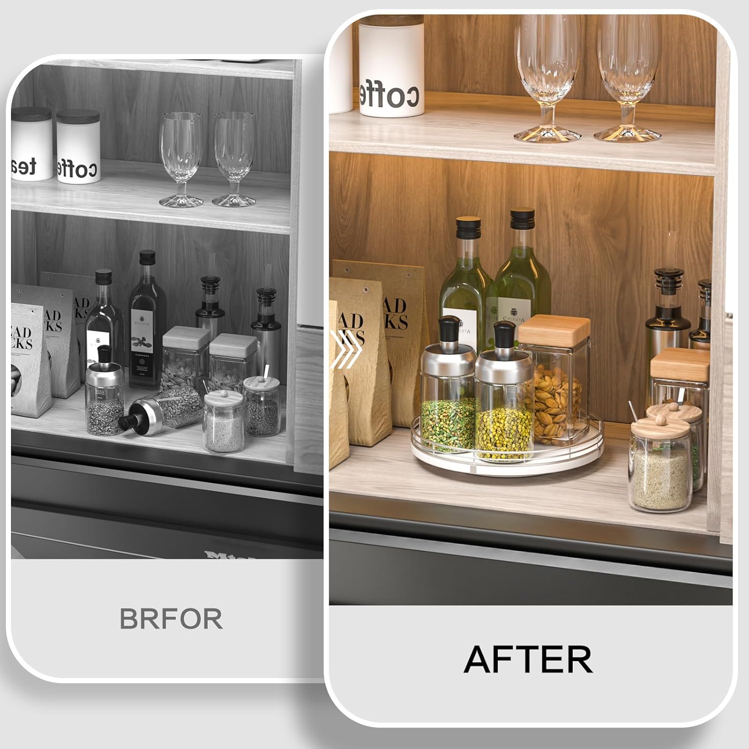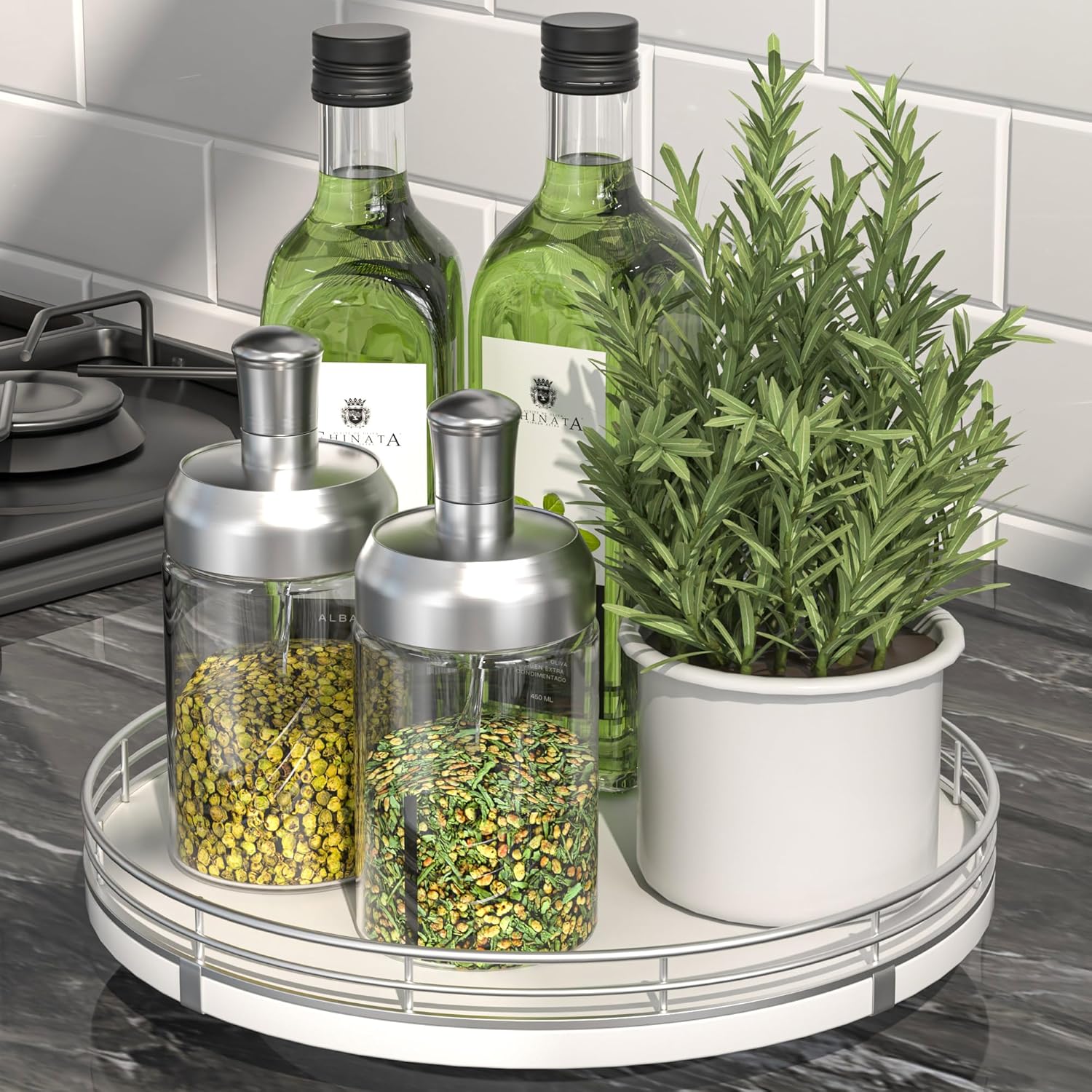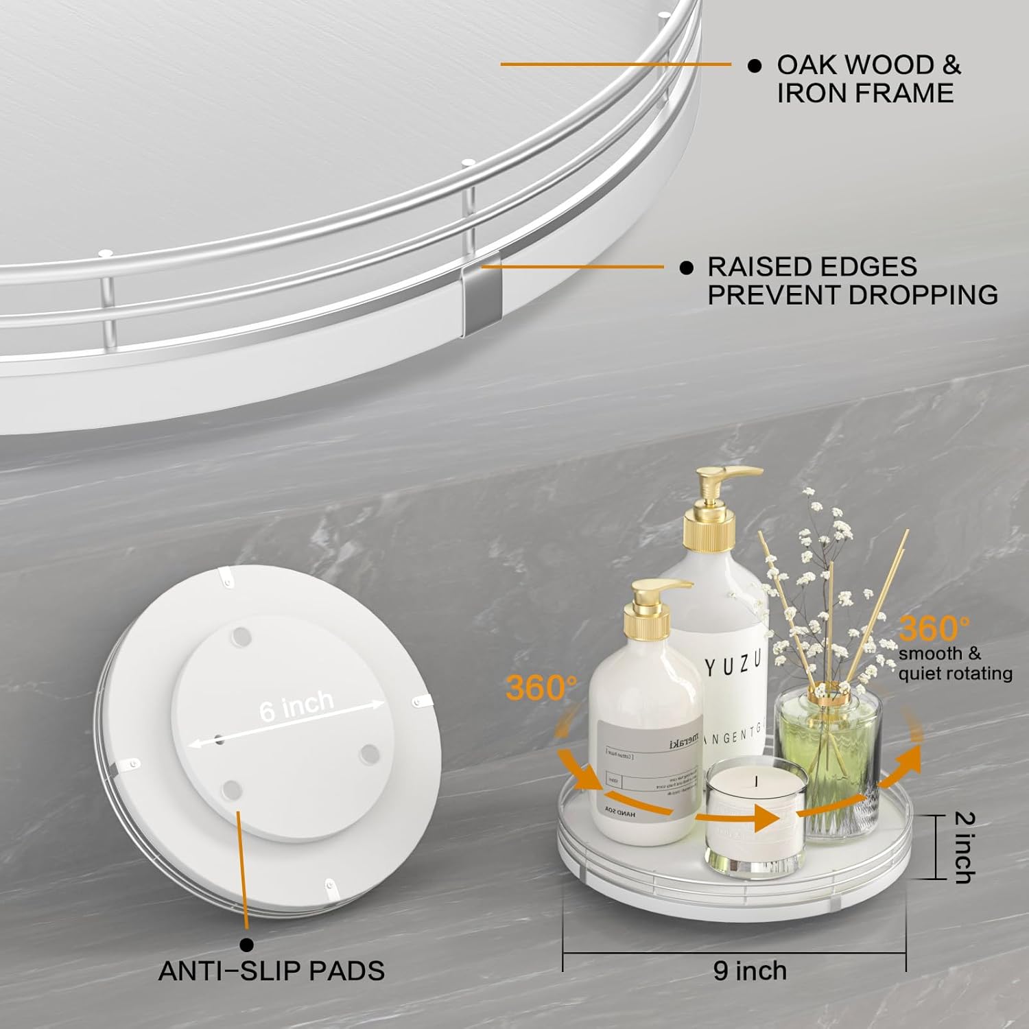 - ๐ง๐ต๐ผ๐๐ด๐ต๐๐ณ๐๐น ๐๐ฒ๐๐ถ๐ด๐ป: The turntable tray features a smooth and silent 360ยฐrotation; Bottom slip-resistant pads for stability and protect your countertop from scratches; Raised edges on each organizer tray to keep items from falling out; Easy to use, no installation required