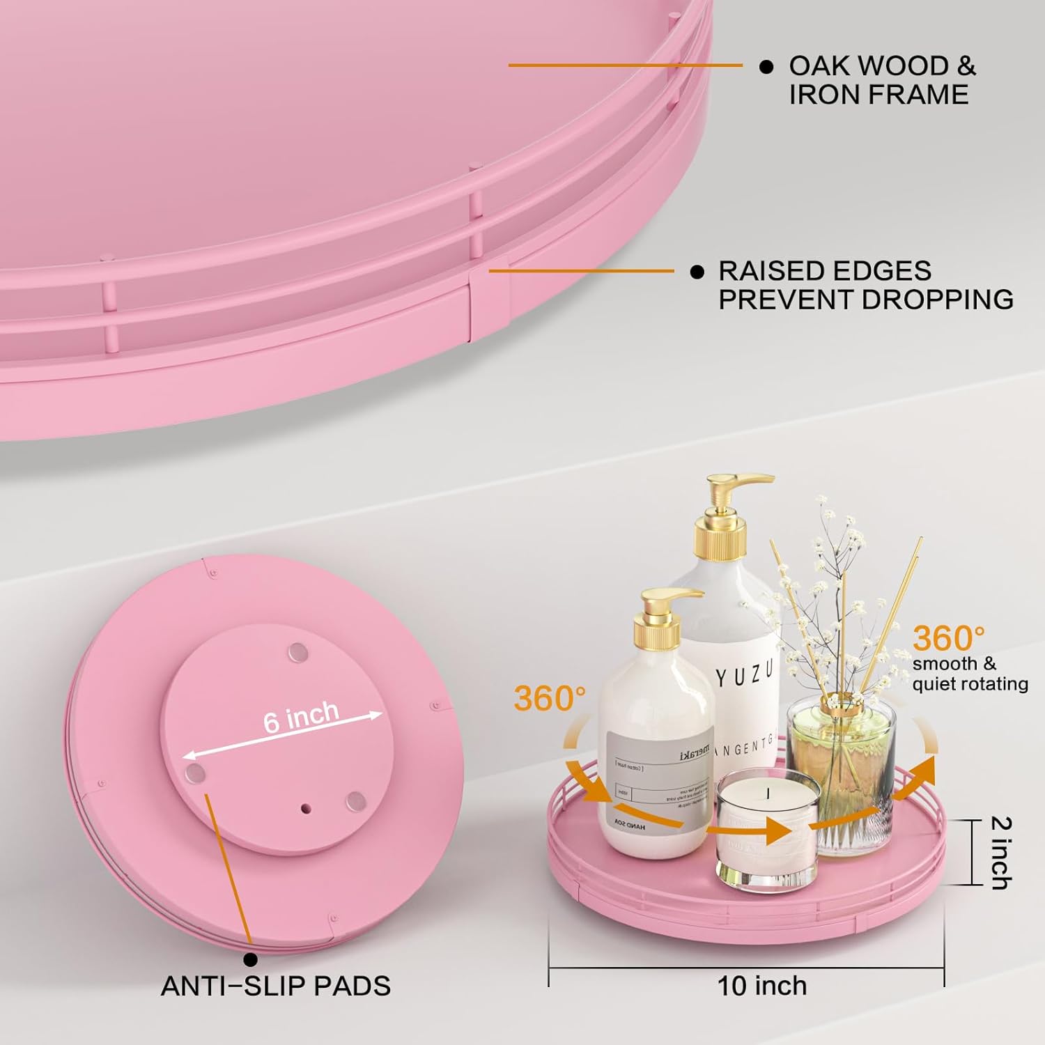 - ๐ง๐ต๐ผ๐๐ด๐ต๐๐ณ๐๐น ๐๐ฒ๐๐ถ๐ด๐ป: The turntable tray features a smooth and silent 360ยฐrotation; Bottom slip-resistant pads for stability and protect your countertop from scratches; Raised edges on each organizer tray to keep items from falling out; Easy to use, no installation required