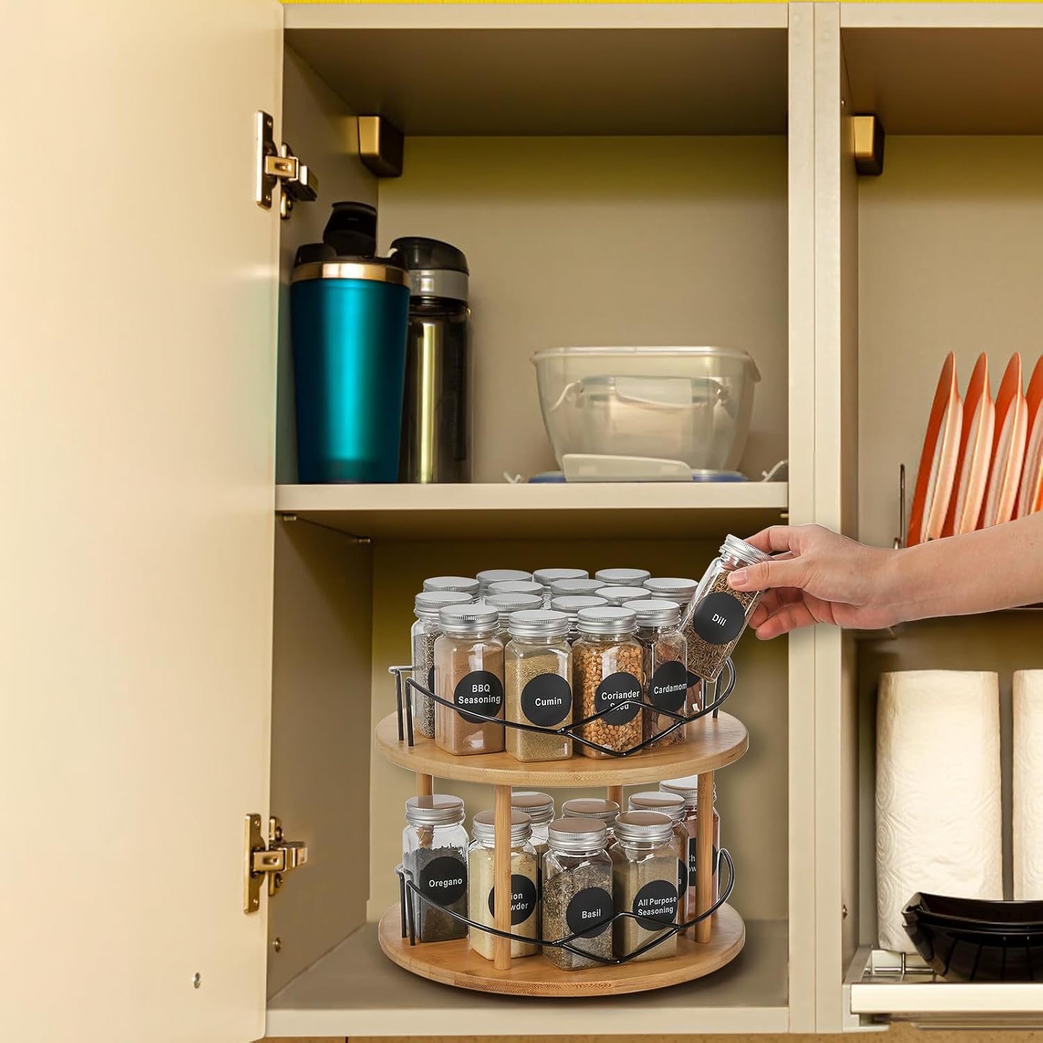 - This spinning spice rack is made from 100% natural bamboo,which has the quality of durable, light weight, can simply clean with a damp cloth; It is easy to assemble.