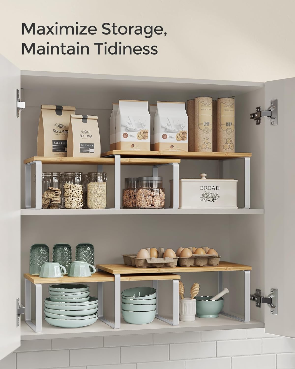 - [Adjustable] With their unique design, with one slightly smaller than the other, these shelf organizers can be stacked on top of one another, nested, used separately, or even in an L-shape. Adjust them how you want to perfectly fit your kitchen space