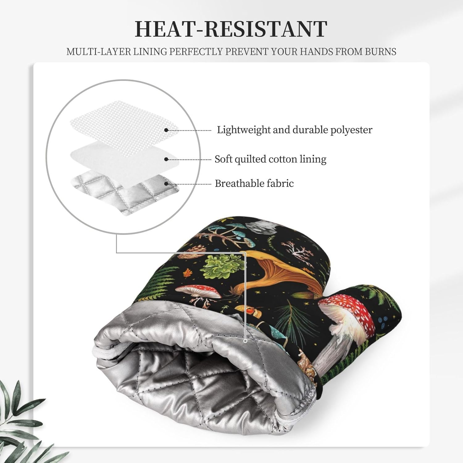 - MATERIAL: Made of high-quality silicone and polyester, our mushroom oven mitts offer a durable and non-slip grip design that provides a secure hold on pots and pans. The soft and thick quilted lining adds extra comfort while you're cooking. Make cooking in your kitchen safer and more convenient.