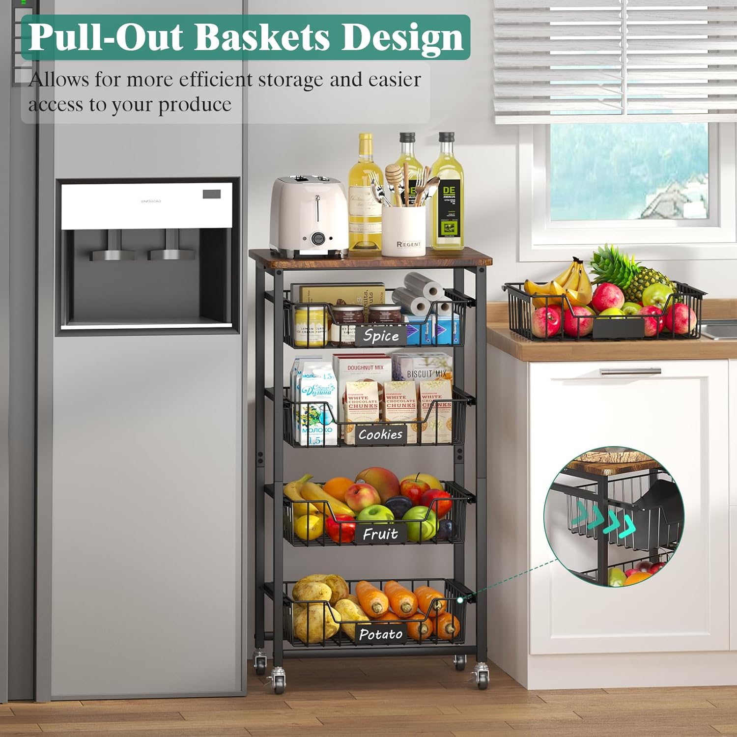5-Tier Vegetable Fruit Basket Kitchen Storage Rolling Cart on Wheels with Pull-Out Baskets and Wood Top for Kitchen Diningroom Pantry