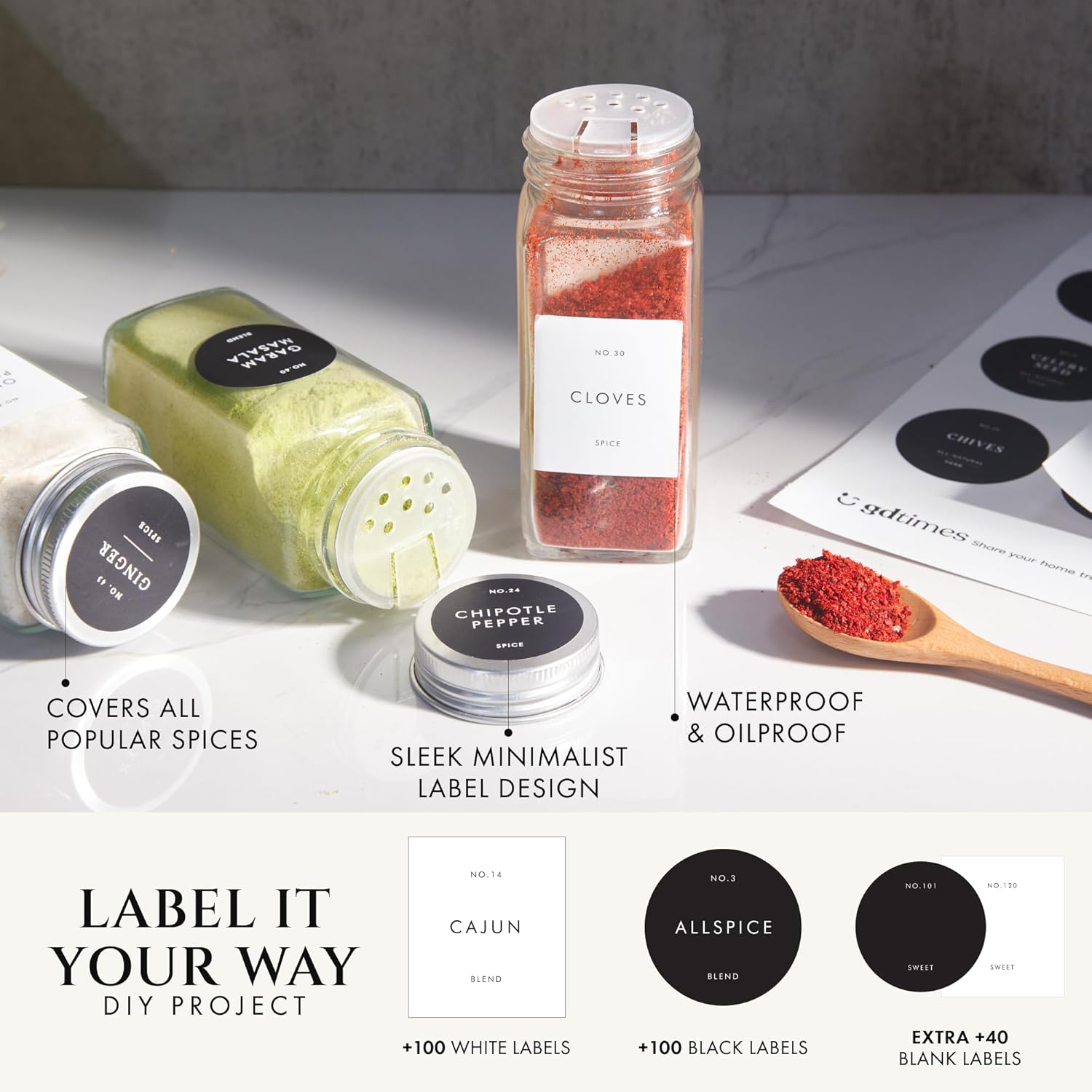 - MINIMALIST ELEGANCE WITH DIY LABELS: Personalize your kitchen with 240 waterproof, oil-resistant empty spice bottles with labels featuring a minimalist font. Covering all common spices, these pre-printed labels for spice jars blend effortlessly with any decor. Blank stickers are included for your unique spice blends