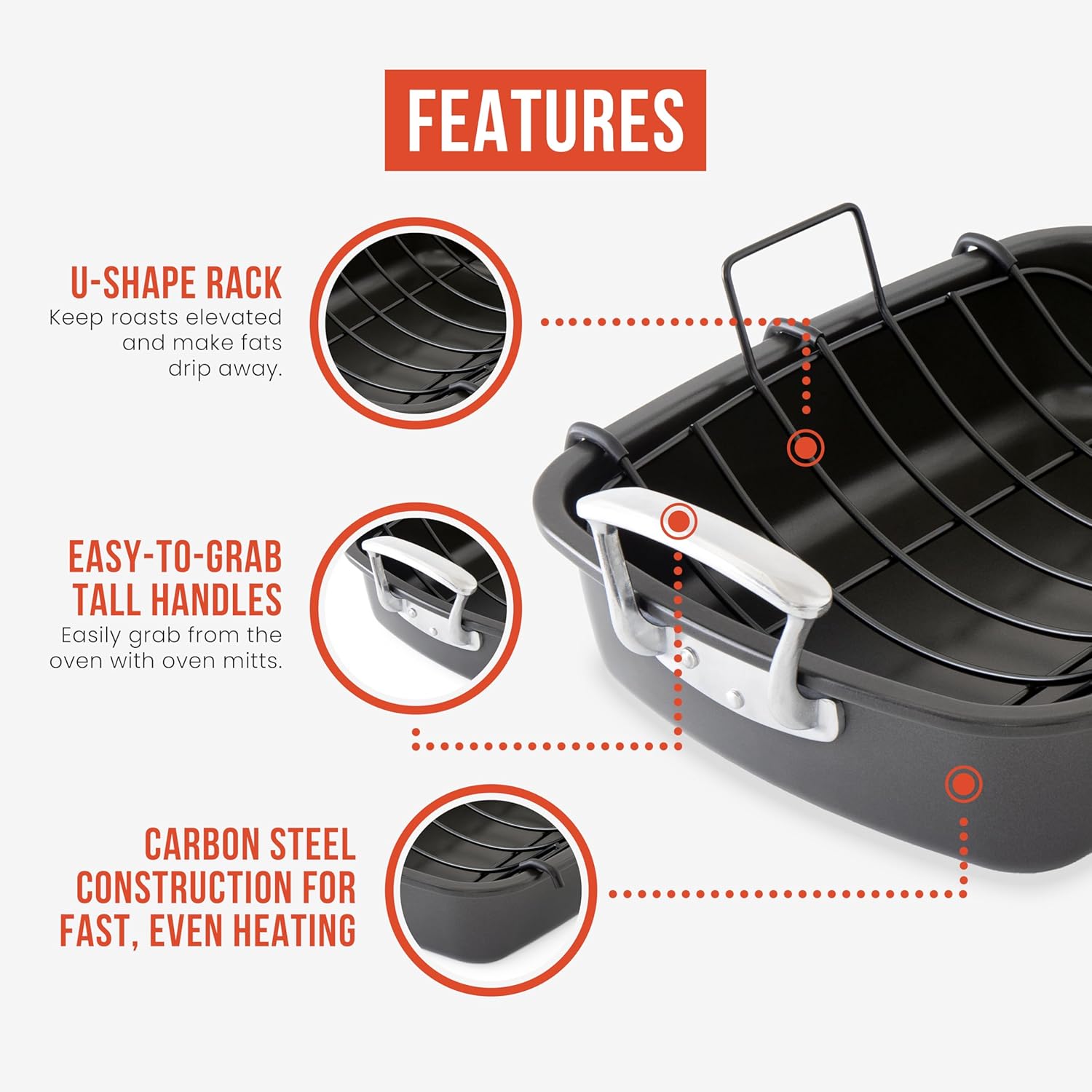 - ✅ U-RACK WITH SILICONE BARS: Say goodbye to scratched pans and uneven cooking. The unique U-Rack, adorned with silicone bars, gently cradles your roast while ensuring it's elevated for perfect, even cooking. The rack elevates the roast, allowing even distribution and air circulation.