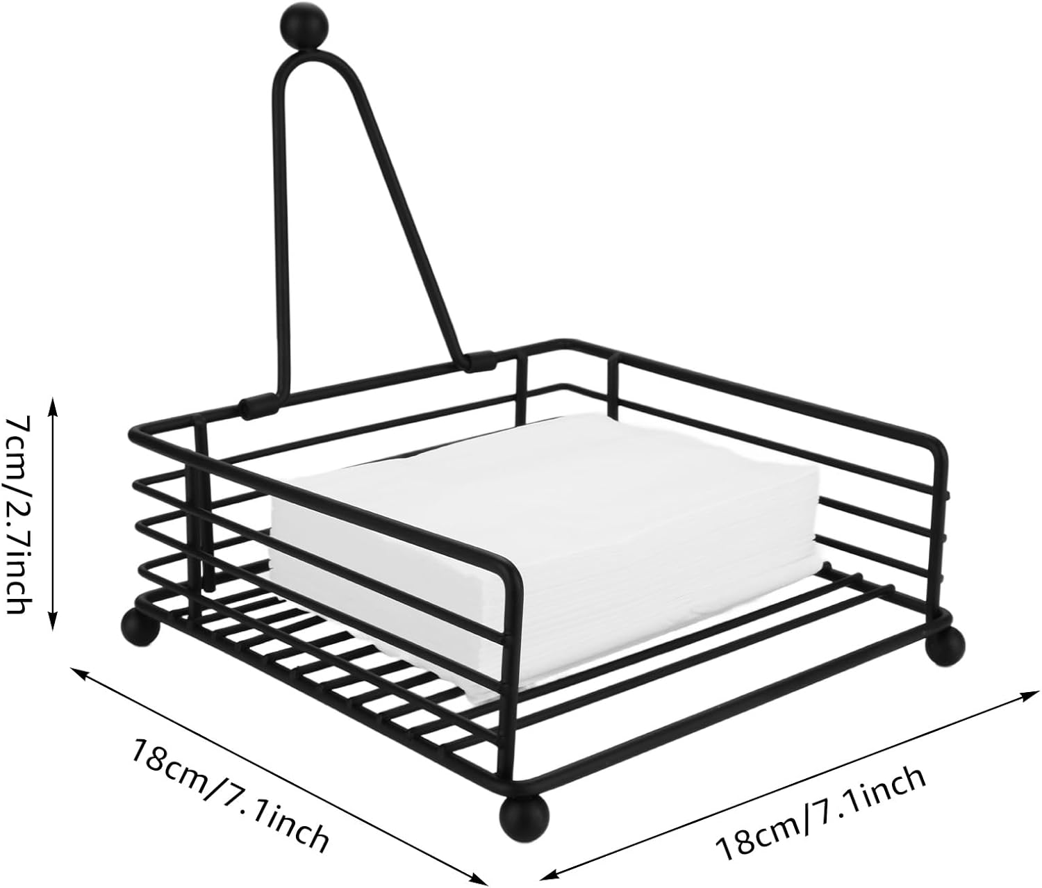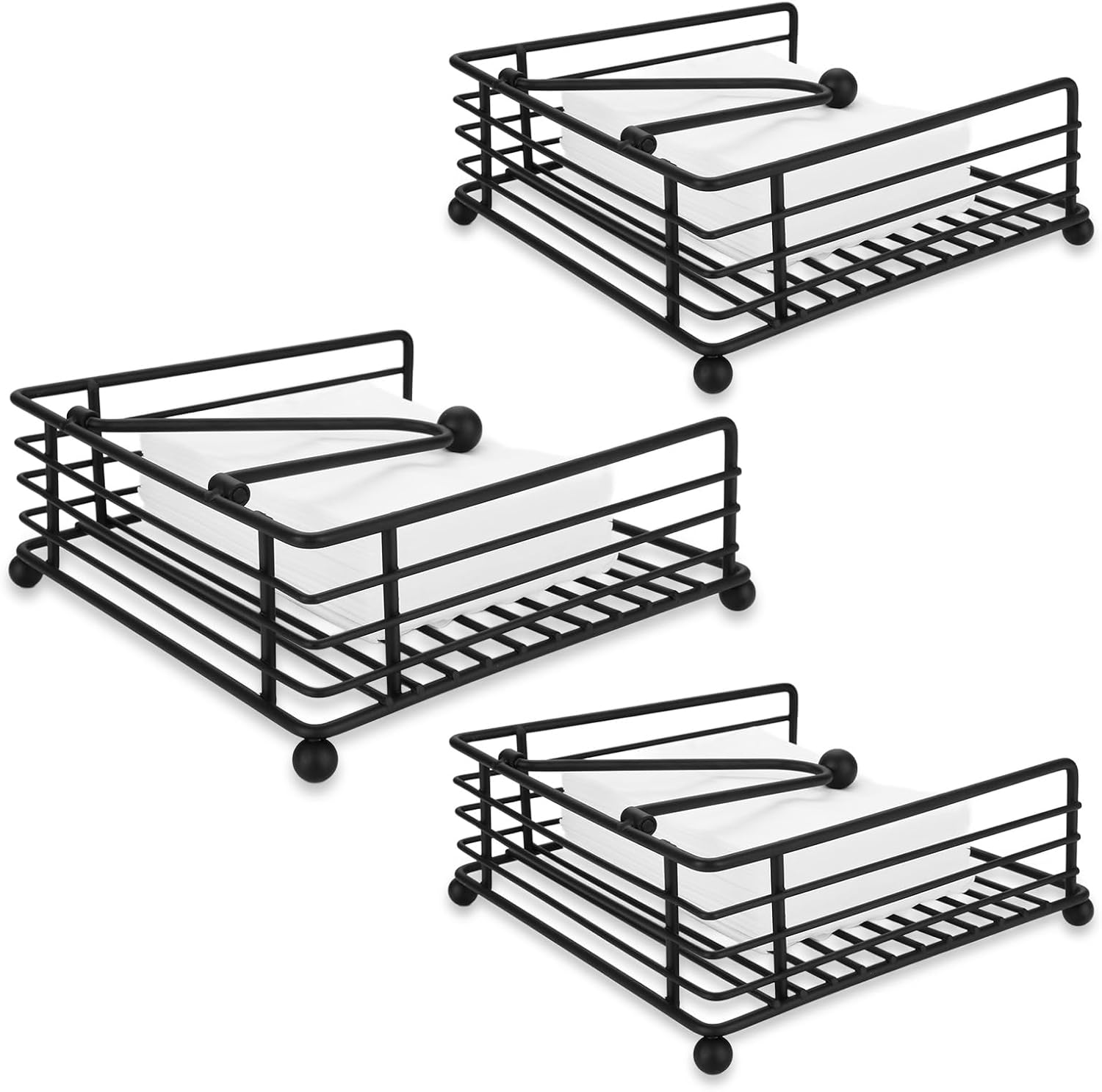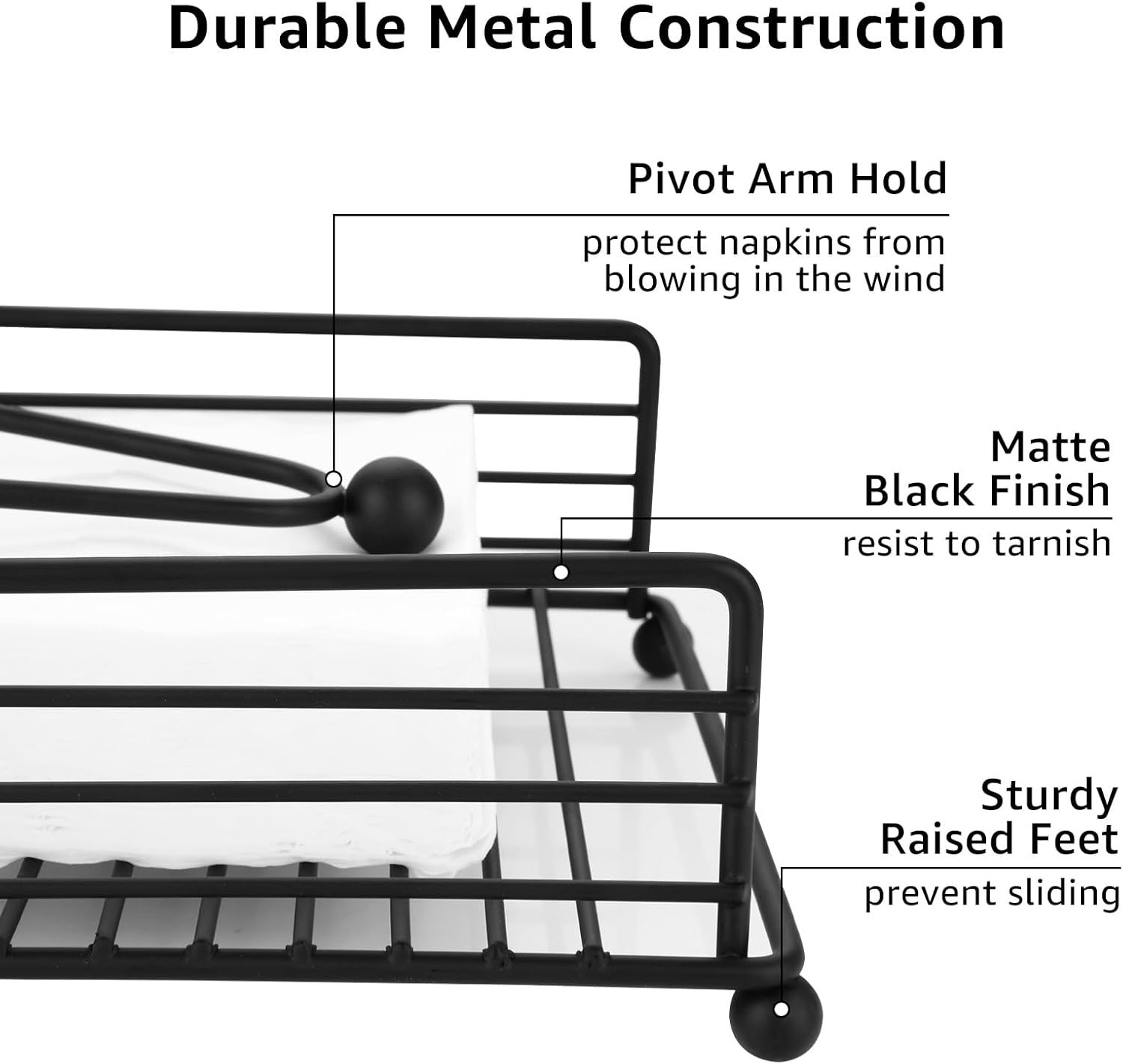 - Durable Metal Construction: Flat Napkin holders are made of quality metal with matte black finish, won't tarnish and does not bend easily; Smooth surface will not puncture or tear paper napkins; Sturdy raised feet, prevent sliding