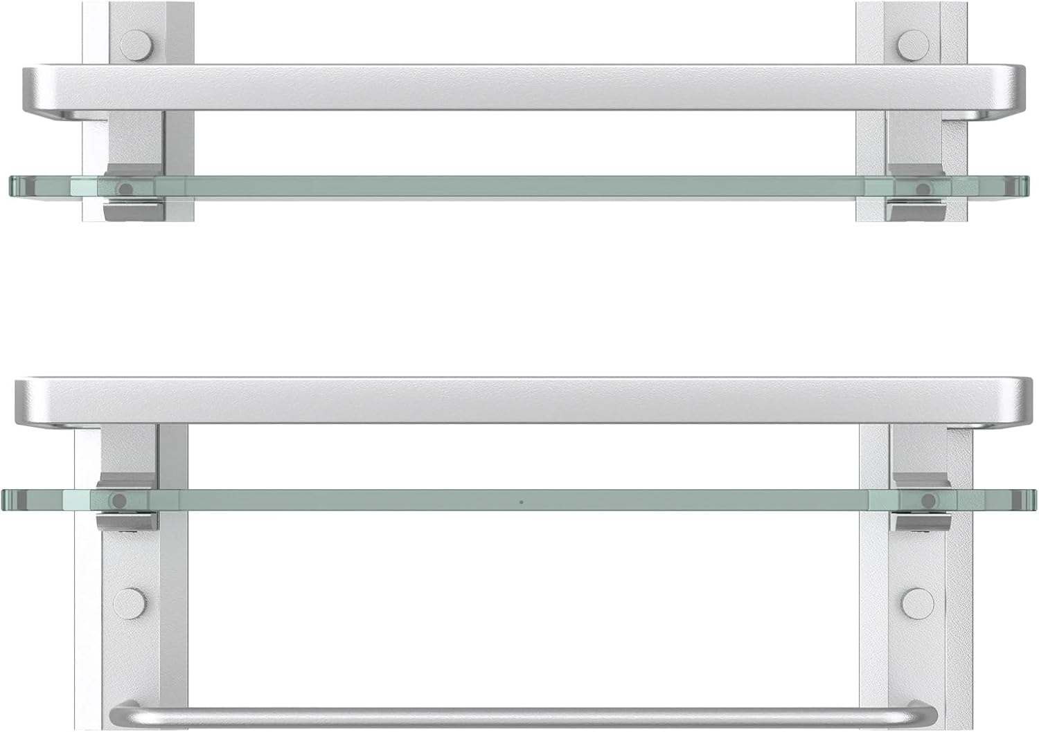- Complete 2-Piece Set: Includes two tempered glass shelves with aluminum guardrails—one with an integrated towel bar, providing versatile storage solutions for your bathroom