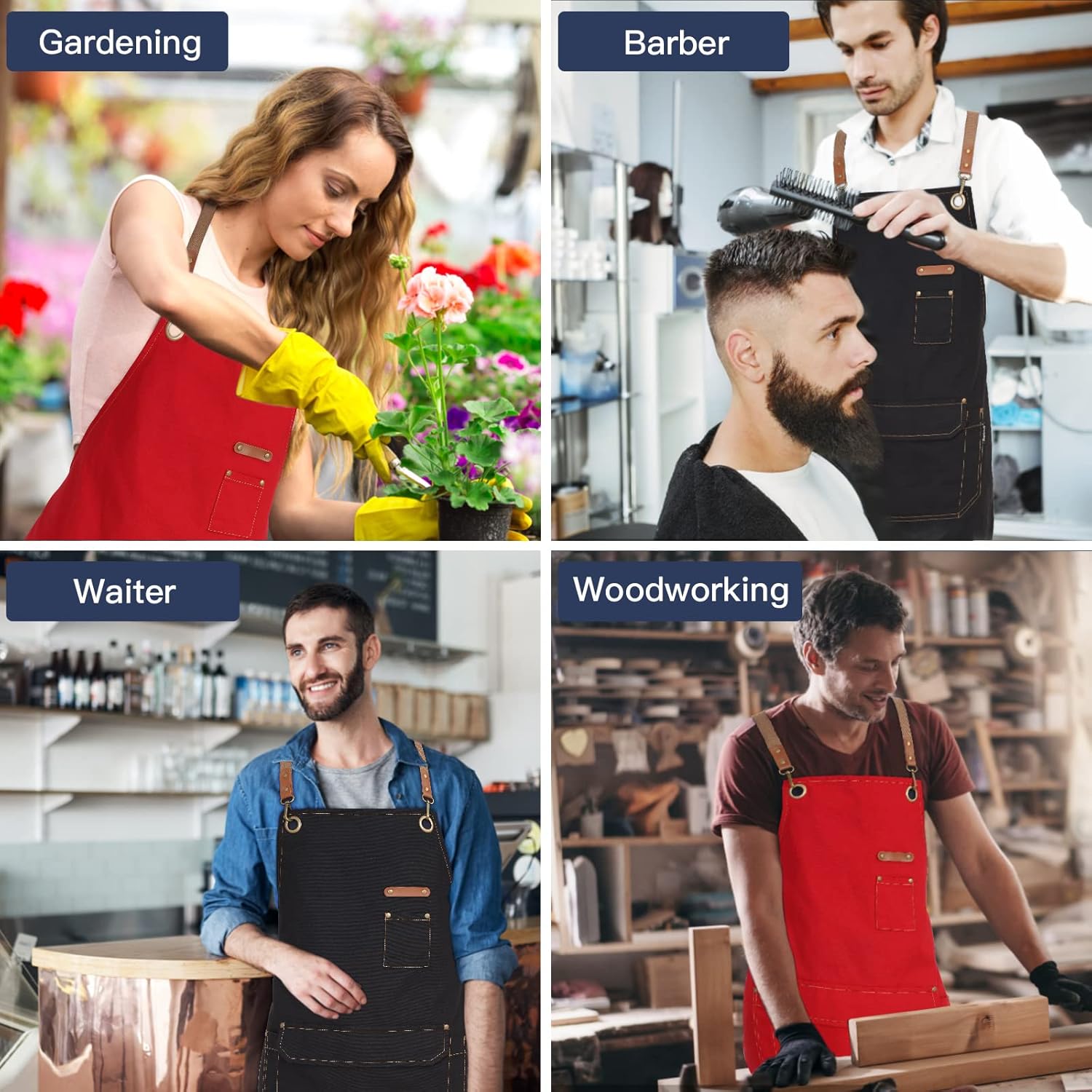- EXCELLENT QUALITY: Made of high density but breathable 100% cotton canvas materials, our Cross-Back Bib Apron for adults is soft to touch and easy to clean. Environmental protection dye, safe for you and your family. Waterproof fabrics always keep out waterdrops and oil stains. Wear-resistant heavy duty canvas workwear apron, XL catering apron machine washable.