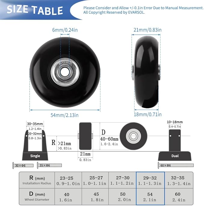 • Widely applications:Fix for most luggage suitcase/trolley case/duffle bag/drawbar box with damaged/jammed/rubber worn wheel replacement repair,but also for replacing inline roller skate wheels