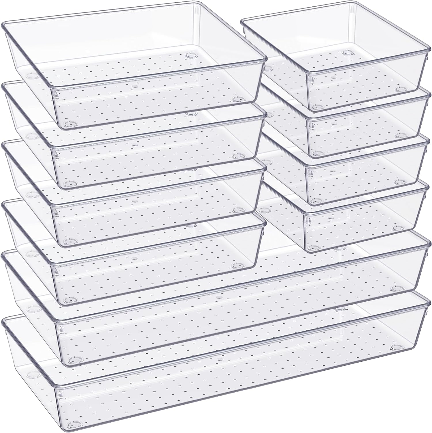Criusia Drawer Organizer, 10 Pack Large Clear Plast Set, 3 Size Versatile Bathroom and Vanity Organizer Trays, Storage Bins for Makeup, Bedroom, Kitchen Utensils