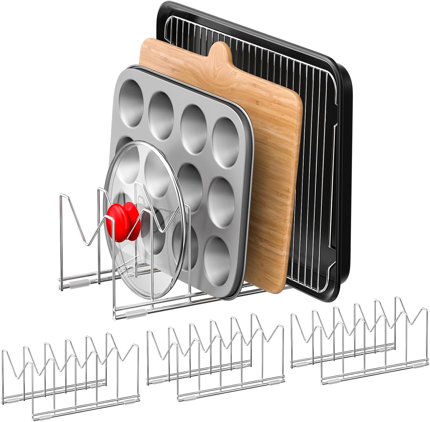 - SUPER WIDE DIVIDER: Each lid holder features five 1.65-inch wide dividers, allowing for organizing various sizes of kitchen or office supplies. Suitable for plates, cutting boards, bakeware, pots, pans, cookie sheets, books, CDs, and files.