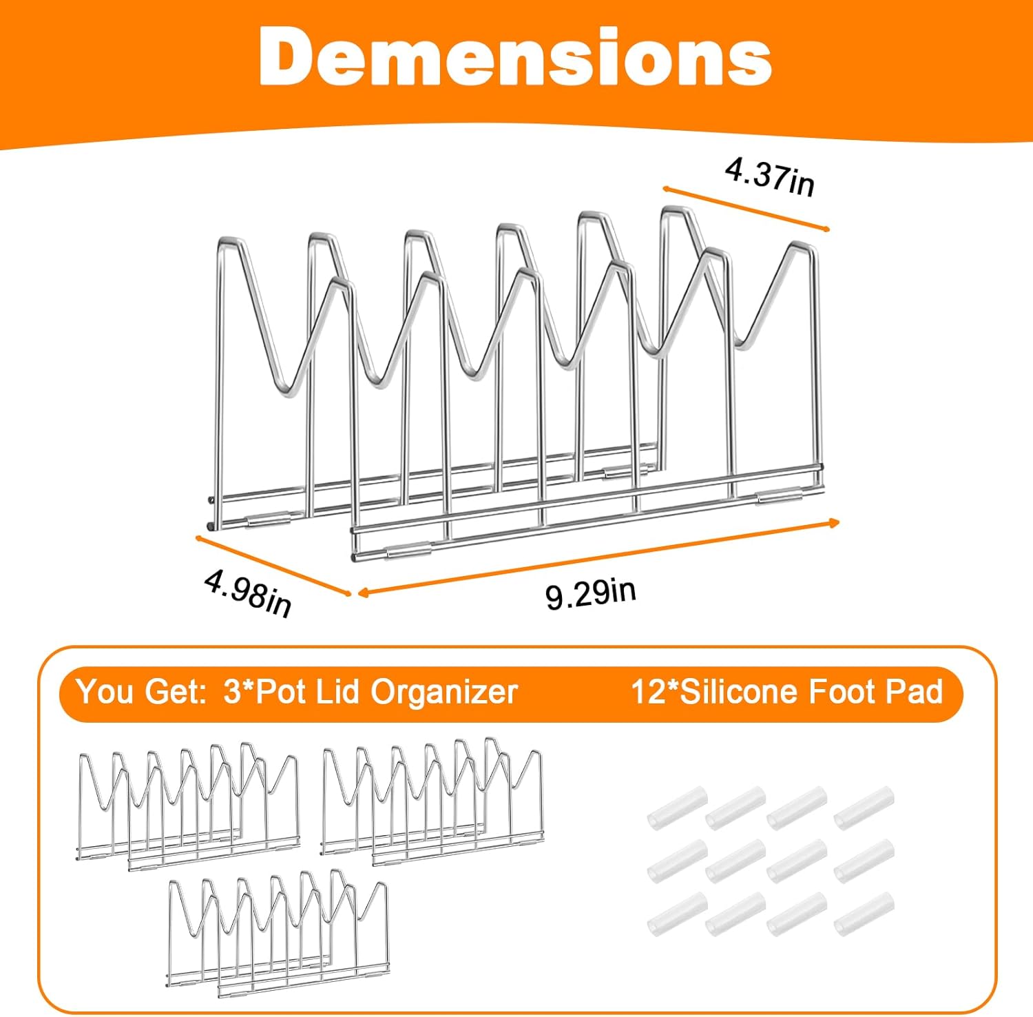 - NICE WARRANTY: Dimensions of the pot lid storage rack are 4.3* 4.7* 9.3 inches. Includes 3* Lid organizer rack, 12* Silicon pad. If you have any quality and missing issues, please do not hesitate to contact us. 24/7 online customer service is available for you.