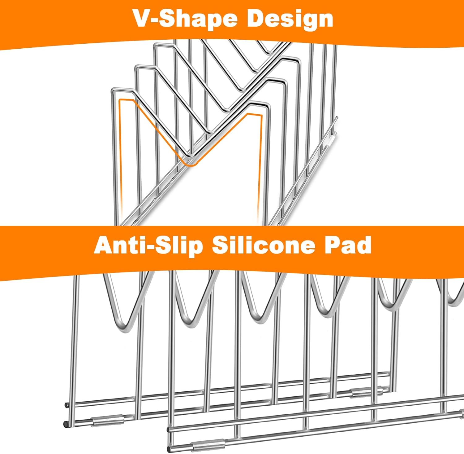 3 Pack Pot Lid Organizer for Cabinet, Stainless Steel Pot Lid Holder with Anti-slip Silicone Mat, Lid Rack for Pans Pots, Bakeware, Plates, Cookie Sheets, Trays, Cutting Boards, Silver