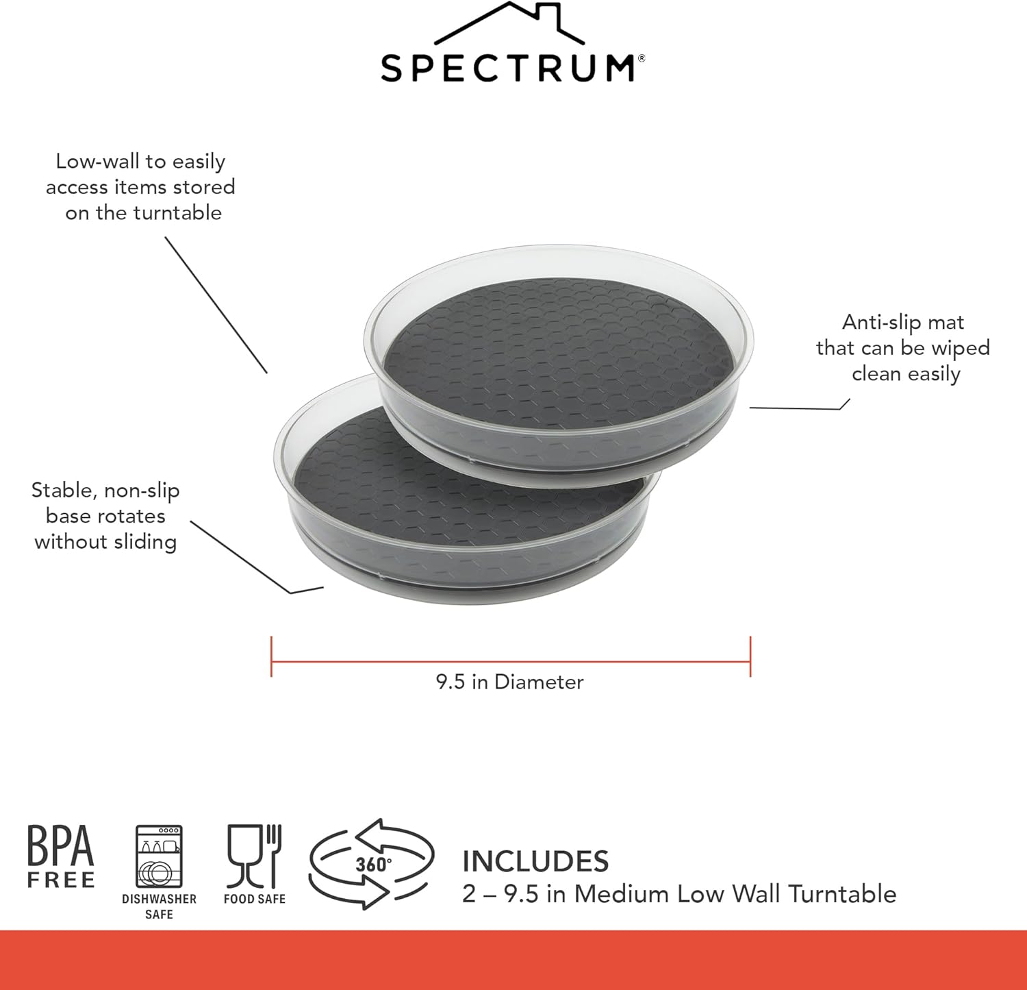 - MEDIUM SIZE TURNTABLE BUNDLE: Perfect 9.5 inch diameter lazy susan organizer pack of 2 accommodates multiple spice jars condiment bottles and medium containers with room for organized storage access while fitting efficiently in standard cabinet spaces