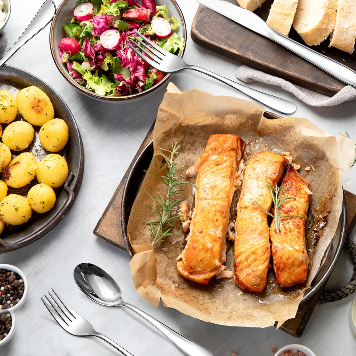 - [Dishwasher Safe]- The total quantity of dinner kinves and dinner forks and dinner spoons is 12. They are all designed ergonomically, which has mirror polished and smooth edges for a comfortable feel. Meanwhile, this kitchen utensil set has a sturdy structure, so it can be used for a long time. Most importantly, the silverware sets are dishwasher safe, so you can just put them in a dishwasher for saving time in hand washing.