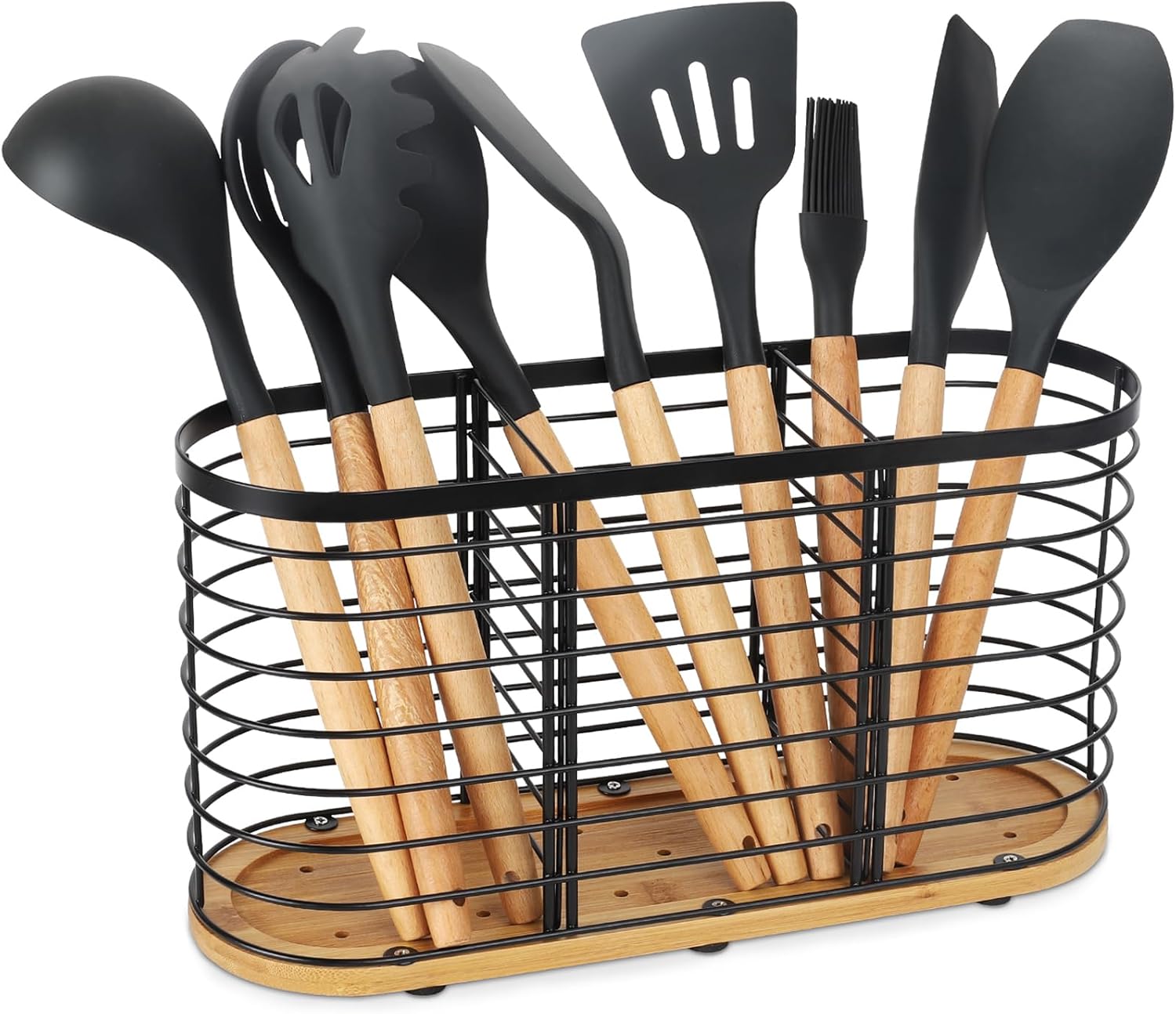 - [Ample Utensil Storage]: This kitchen utensil holder measures 13.5" x 4.2" x 6.9", offering ample space for your culinary essentials. With three compartments, it accommodates a variety of items, including cookware, knives, spatulas, tongs, egg beaters, ladles, skimmers, peelers, corkscrews, silverware, forks, chopsticks, and more. Maintain a neat and organized kitchen countertop effortlessly.