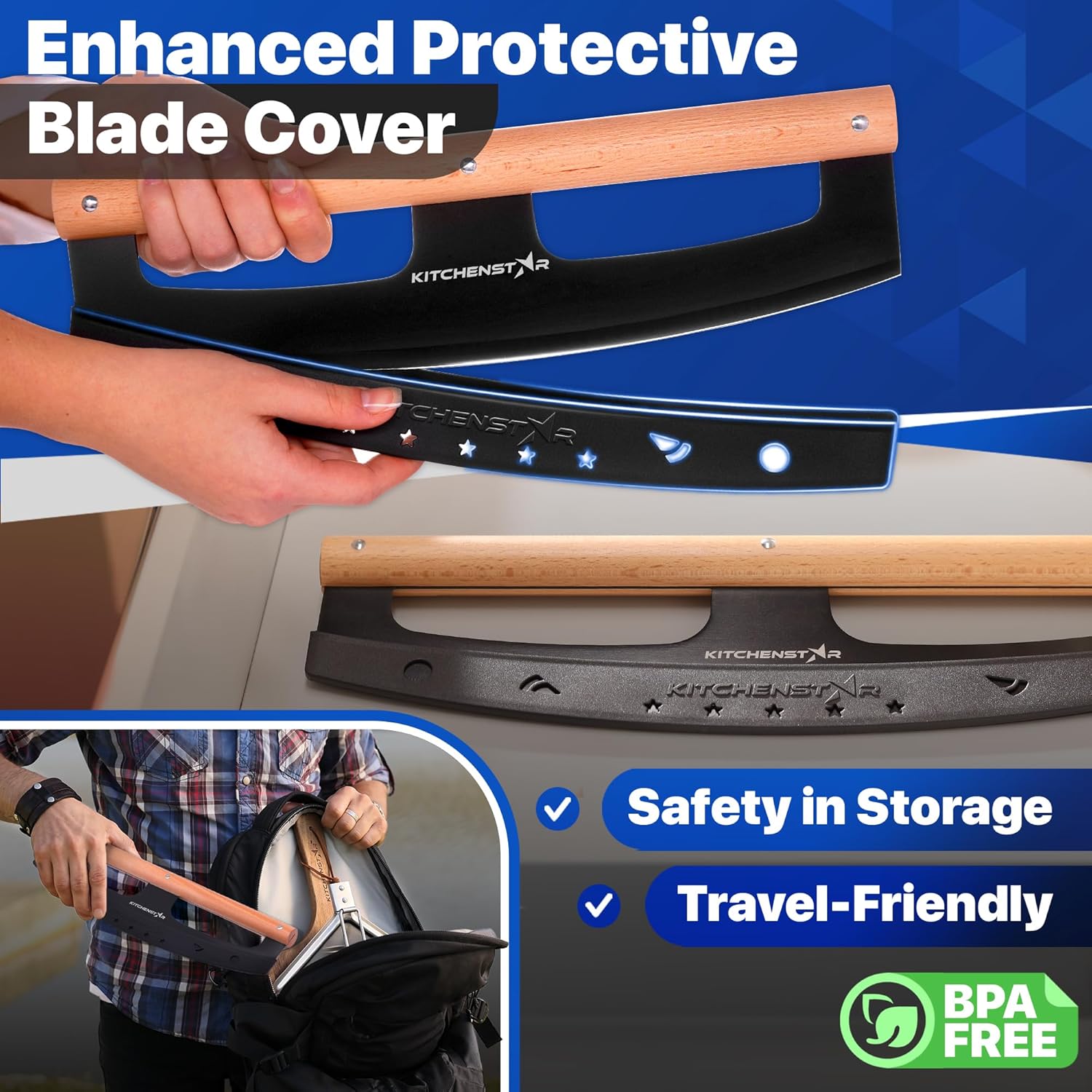 KitchenStar 16-Inch Pizza Cutter Rocker Blade - Razor Sharp Stainless Steel Slicer Knife, Stylish Beech Wood Handle, Protective Cover - Professional Pizza Oven Accessories, Black