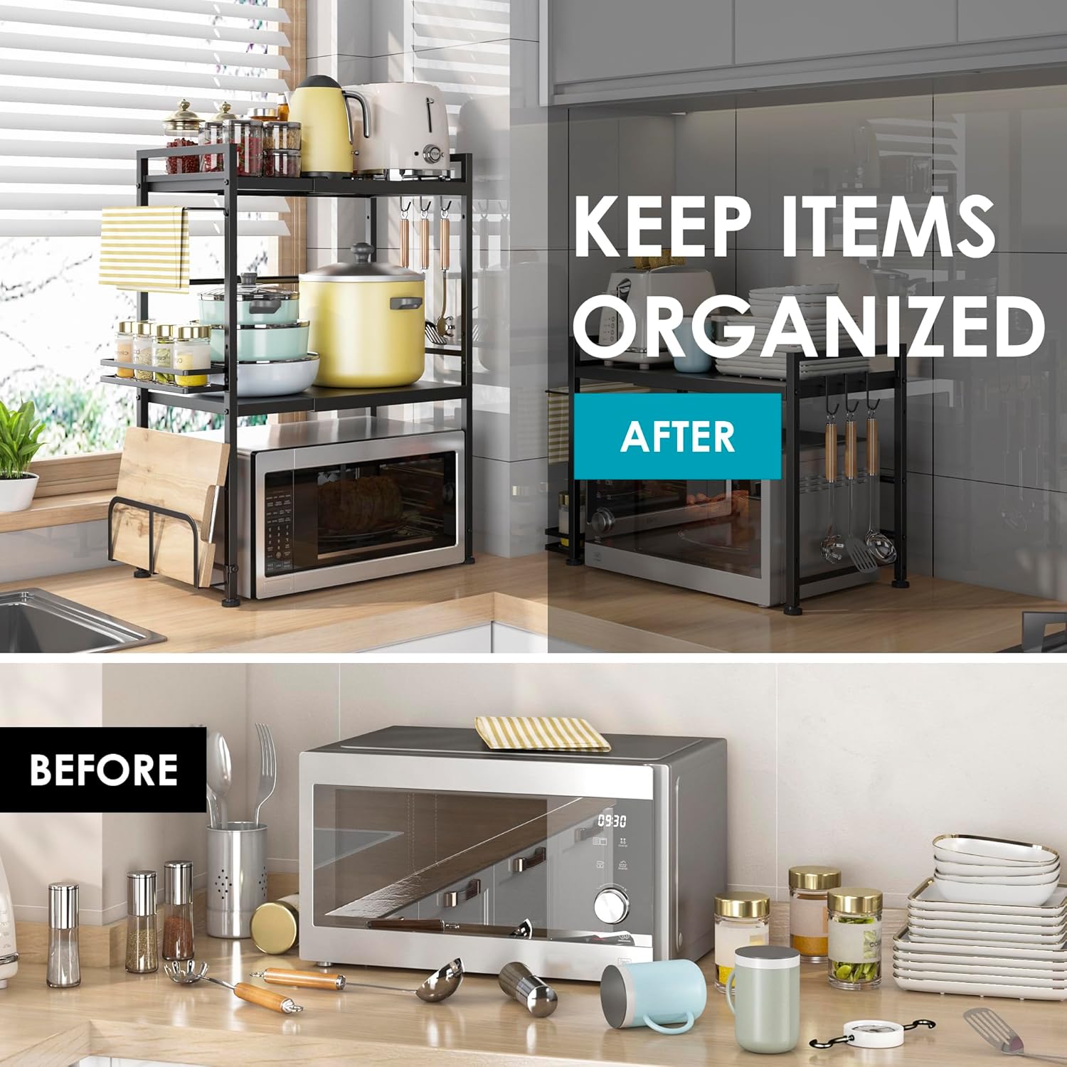 DOLALIKE Microwave Oven Rack, Expandable Microwave Stand Countertop Kitchen Utensils Tableware Storage, Carbon Steel Over Microwave Shelf Countertop with 6 Hooks