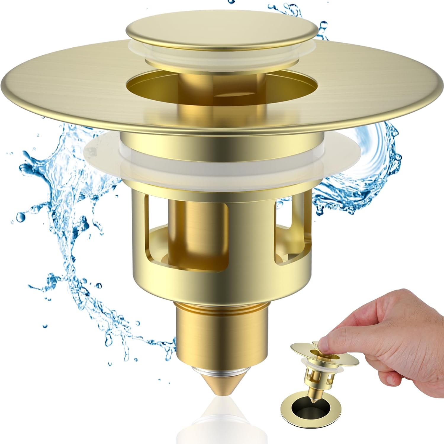 - 【Premium All Metal Material】Our pop up sink drain strainer is mainly made of high quality stainless steel material. It is corrosion resistant and long-lasting. Bounce cap and hair catcher basket core are made of high-quality brass with brushed gold finish. Good rebound strength, quick seal and drainage with a single press. With 3 silicone seals for different size drain holes