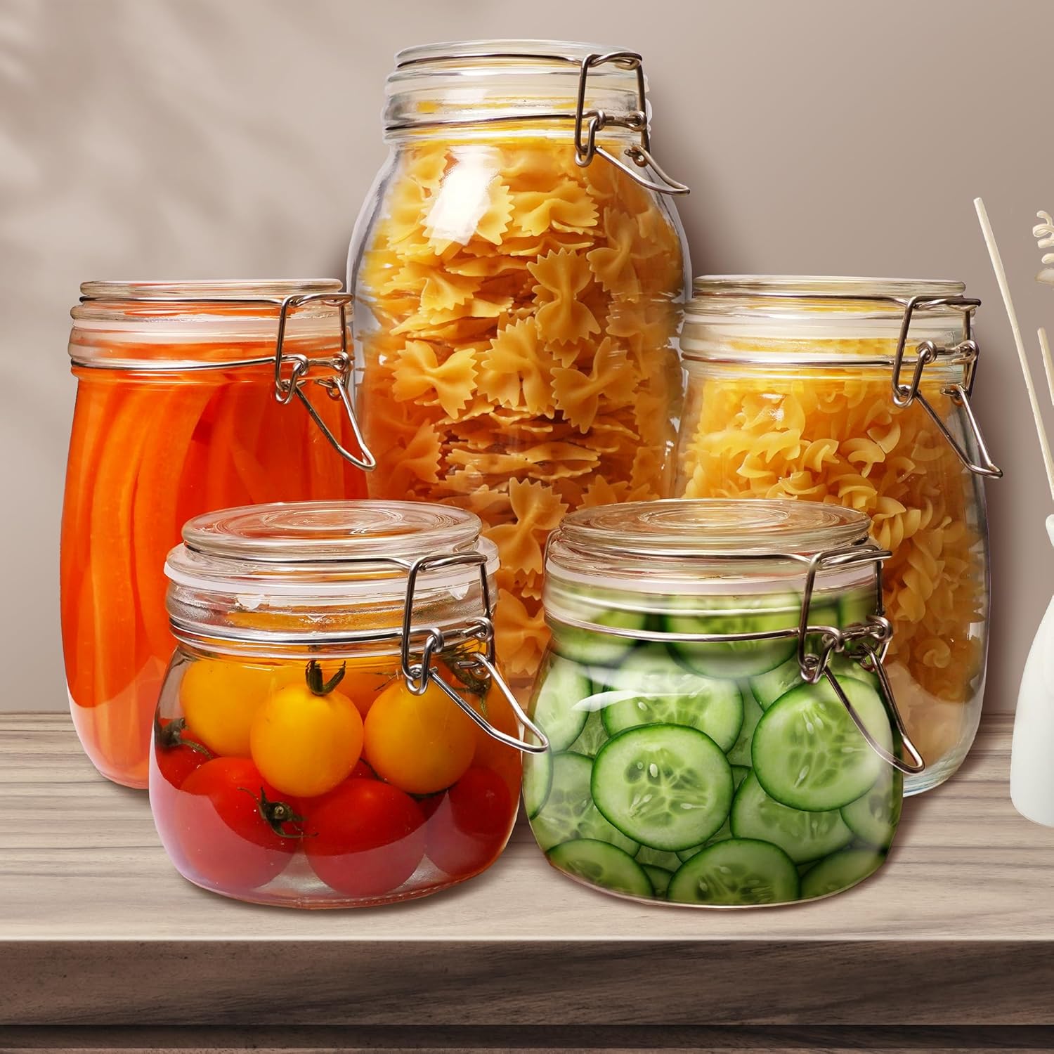 - [ Stronger Airtight Clamp Lids ]: Our Clamp Lids is made of stainless steel, equipped with food-grade silicone sealing ring, which ensures an airtight seal and prevents the flow of air and the entry of ants. The Air tight glass jars with precision-fit gasket prevents leaks,preserving flavors and extending shelf life.Elevate your kitchen organization and keep pantry staples at their prime with this trusted and reliable air tight glass container jars