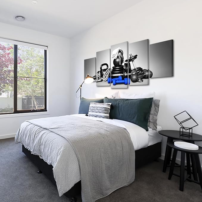 KREATIVE ARTS Large 5 Panel Wall Art Fitness Equipment Canvas Prints Black and Blue Gym Pictures for Boys Men Bedroom Artwork Painting Home Decor Sportsman Gifts Decoration
