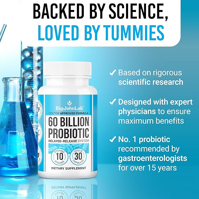 BIGJOHNLAB® Probiotics 60 Billion CFU – 10 Strains + Organic Prebiotics – Immune, Digestive & Gut Health – Supports Occasional Constipation, Diarrhea, Gas & Bloating – for Women & Men – 30ct