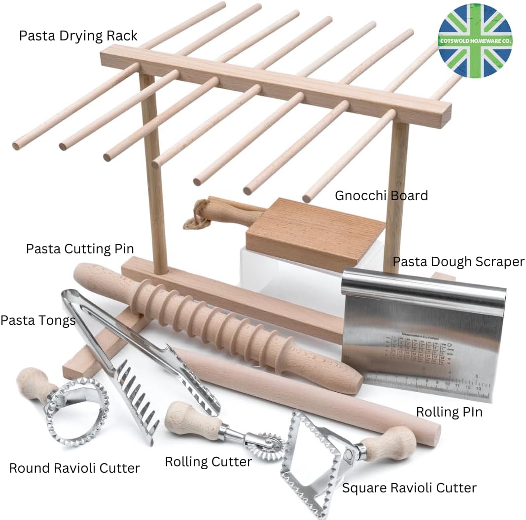 Ultimate 9 Pcs Pasta Making Tool Set Pasta Drying Rack, Pasta Tongs, Two Ravioli Stamp Maker Cutter And Roller Wheel Set, Two Pasta Rolling Pins, Gnocchi Board and Scraper By Cotswold Homeware Co
