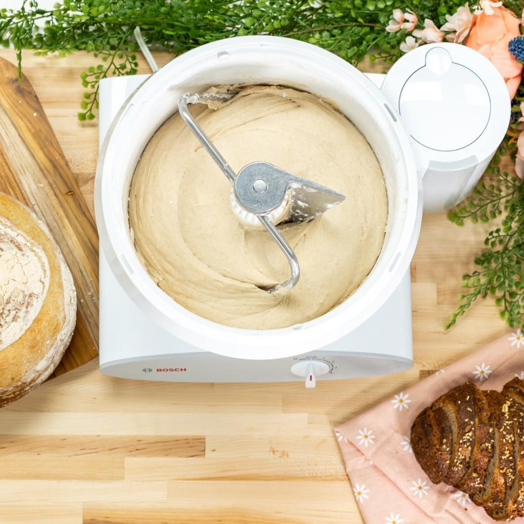 - Includes Bosch Mixer, wire whips with plastic whip drive, dough hook, bowl, lid, splash ring, and NutriMill plastic dough hook extender
