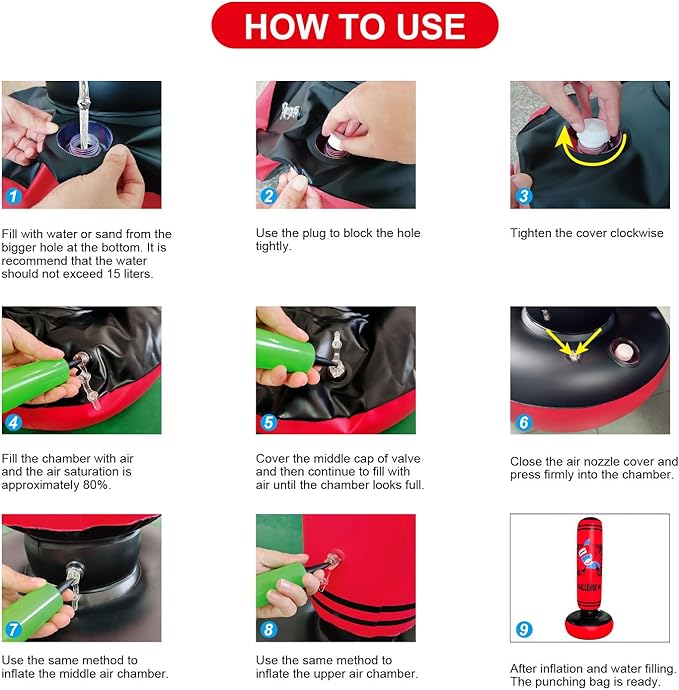 • 1, the new design puts the double water part on the base, which is very convenient to add water or sand,2, the middle connection position is thick, and the rebound speed is faster and more stable when boxing. 3, the inflation port all use double cover air nozzle, the speed of inflation and discharge is very fast.