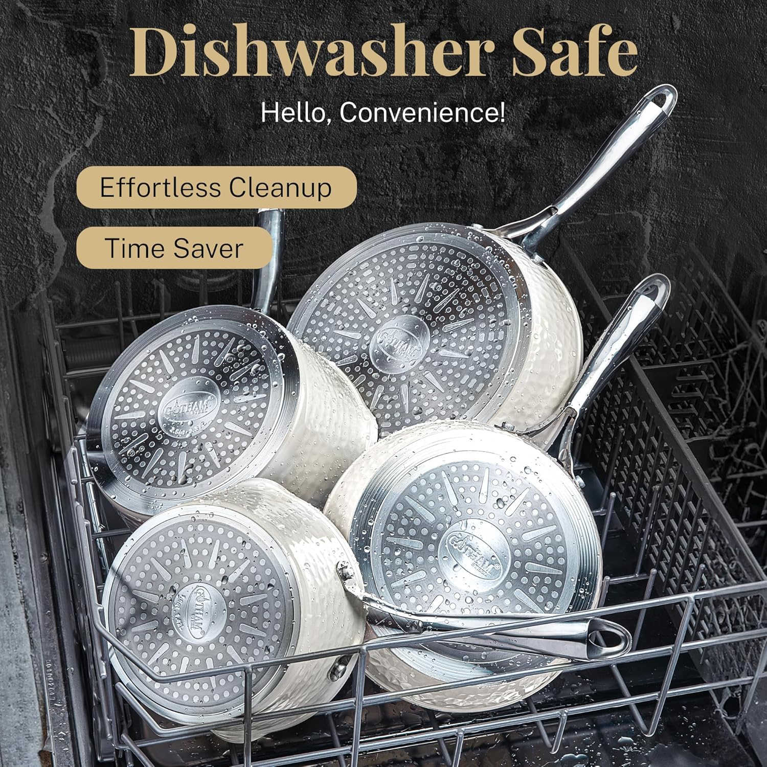 - EASY CLEANUP: Gotham Steel Hammered Cream’s triple coated design allows for an effortless wipe down after using. Each piece of cookware is dishwasher safe allowing you to simply throw your cookware in the dishwasher after using for a fast and easy cleanup experience.