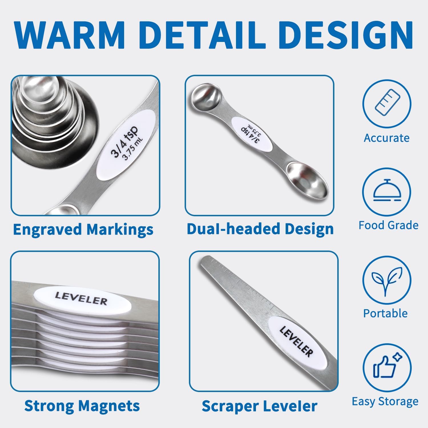 - 【Convenient Storage】Unique stackable design makes cups nest together easier, and each piece of stainless steel measuring teaspoon has an enhanced magnetic center for easy stacking together, to save kitchen space and reduce clutter, making your kitchen look neat and elegant.