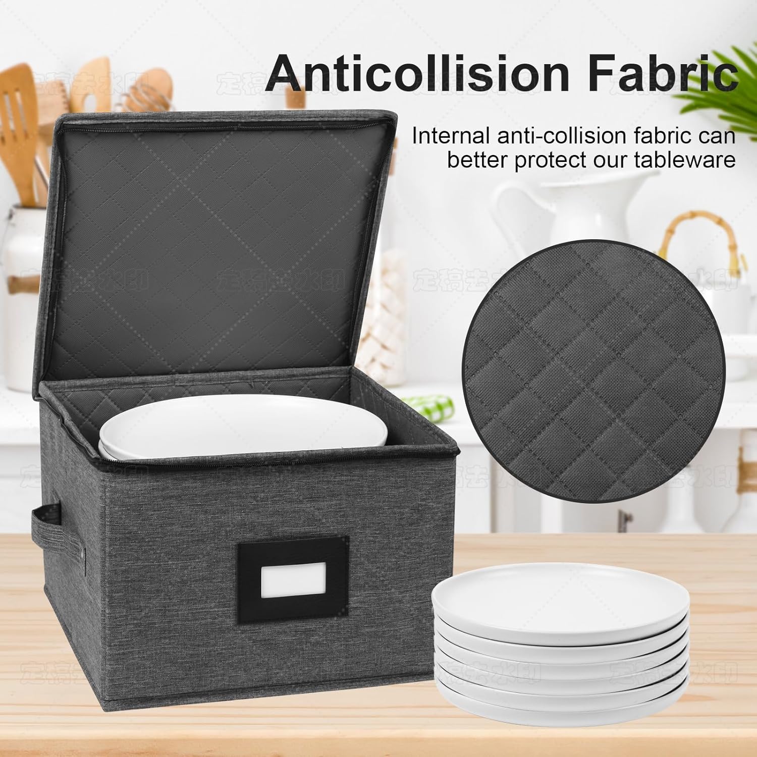 - STACKABLE CHINA STORAGE CONTAINERS - Dish storage containers Dimensions are 12''L x 12'' W x 8''H, holds 48 plates, includes 48 felt plate separators to protect dishes against chipping and scratching, the top of the product can be stacked