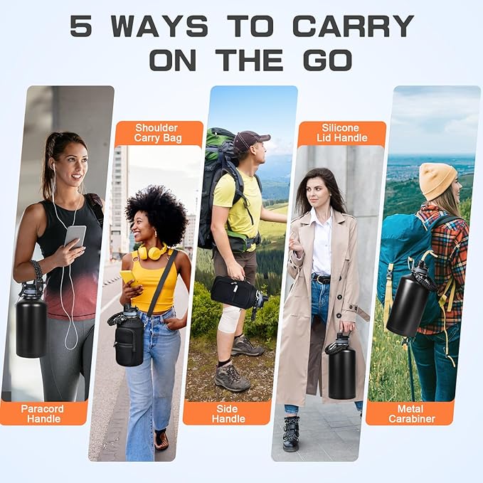 • Triple Wall Insulation - Sweat-proof 1 gallon insulated water bottle features a copper-plated triple-wall vacuum insulation that keeps your drinks stay ice cold up to 48 hours and warm up to 24 hours.