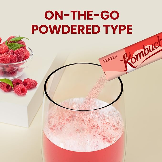 TEAZEN Raspberry Kombucha Tea, Hydration Drink Mix, Sugar Free, Live Probiotics & Prebiotics, 30 Sticks, 5.29oz