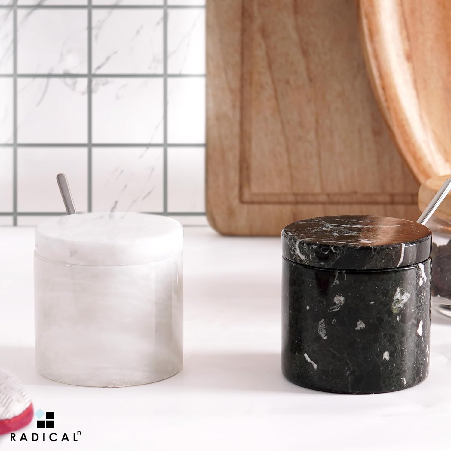 - Functional Design with Lid & Tray - Includes two salt cellar containers with matching lids and a marble tray to keep salt, pepper, or spices fresh and organized on your countertop.