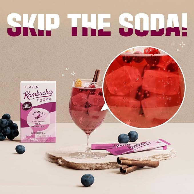• 🍷 MULLED WINE Flavor: Enjoy it hot or iced—just the way you like it! Infused with the cozy flavor of cinnamon and spices, this kombucha is inspired by the classic European winter drink Vin Chaud. With heat-stable postbiotics, it's perfect for mixing into hot water for a soothing tea, or into cold water with ice for a refreshing twist on mulled wine.