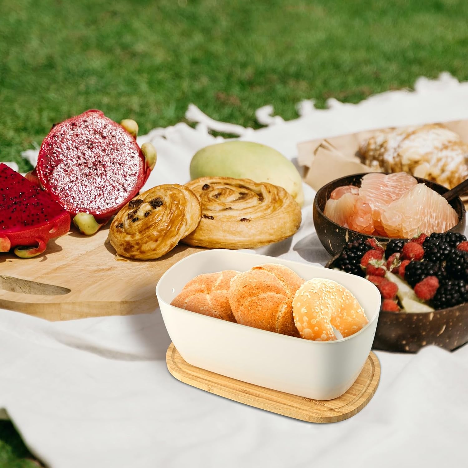 - Dual-Purpose Bamboo Lid:The sturdy bamboo lid acts as a cutting board (front) with a juice groove to catch liquids and a crumb-collecting surface (back). Perfect for slicing fruits, veggies, or serving bread and cheese.