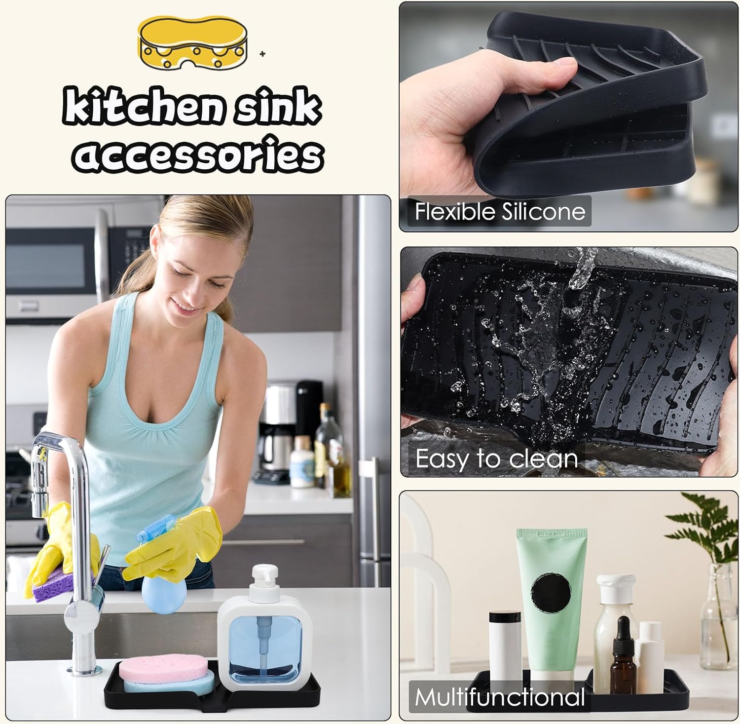 - ★Prevent Items From Sliding: The Silicone Sink Tray has a raised edge and an anti-skid base that prevent your items from sliding or falling off. You can keep your soap or sponge securely and firmly in place without worrying about them slipping into the sink or onto the floor.