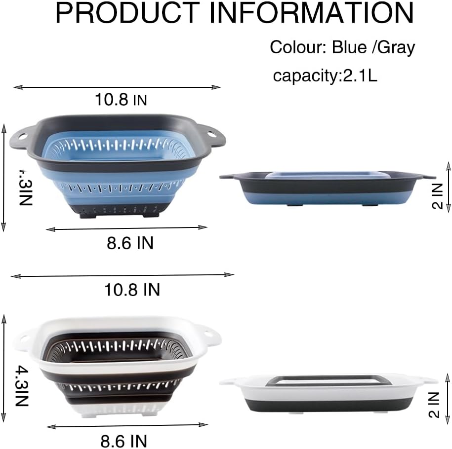 Collapsible Colander Set, Square Round Triangles Silicone Kitchen Strainer Perfect for Draining Pasta Vegetable fruit 2 PCS (10.8"L x 8.6"W x 2"H, Blue & Gray)