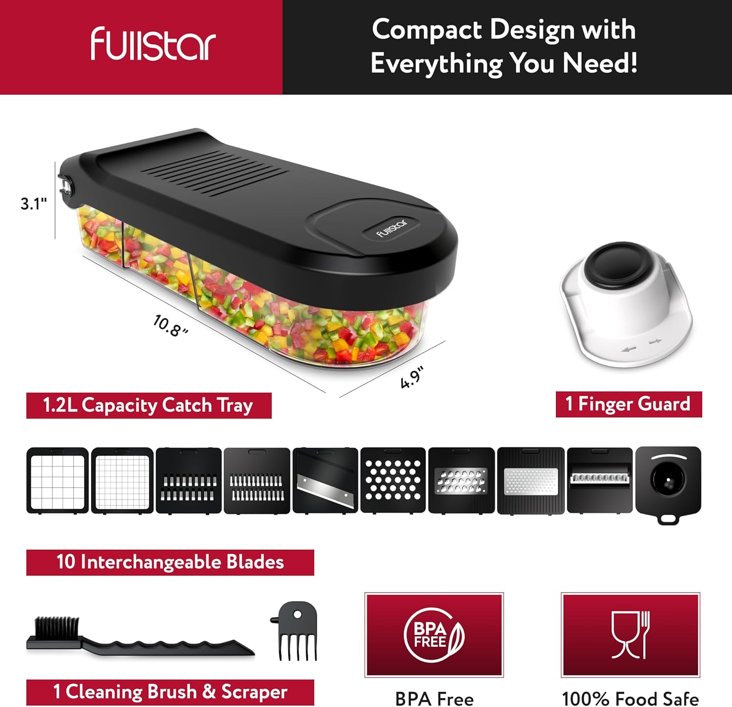 - Great Value & Quality - The Fullstar vegetable chopper is an affordable chopper vegetable cutter and cheese grater that doesn't compromise on quality. It includes 10 stainless steel blades, 1 cleaning brush, 1 finger guard and a 1.2L container for safe and efficent meal prepping.