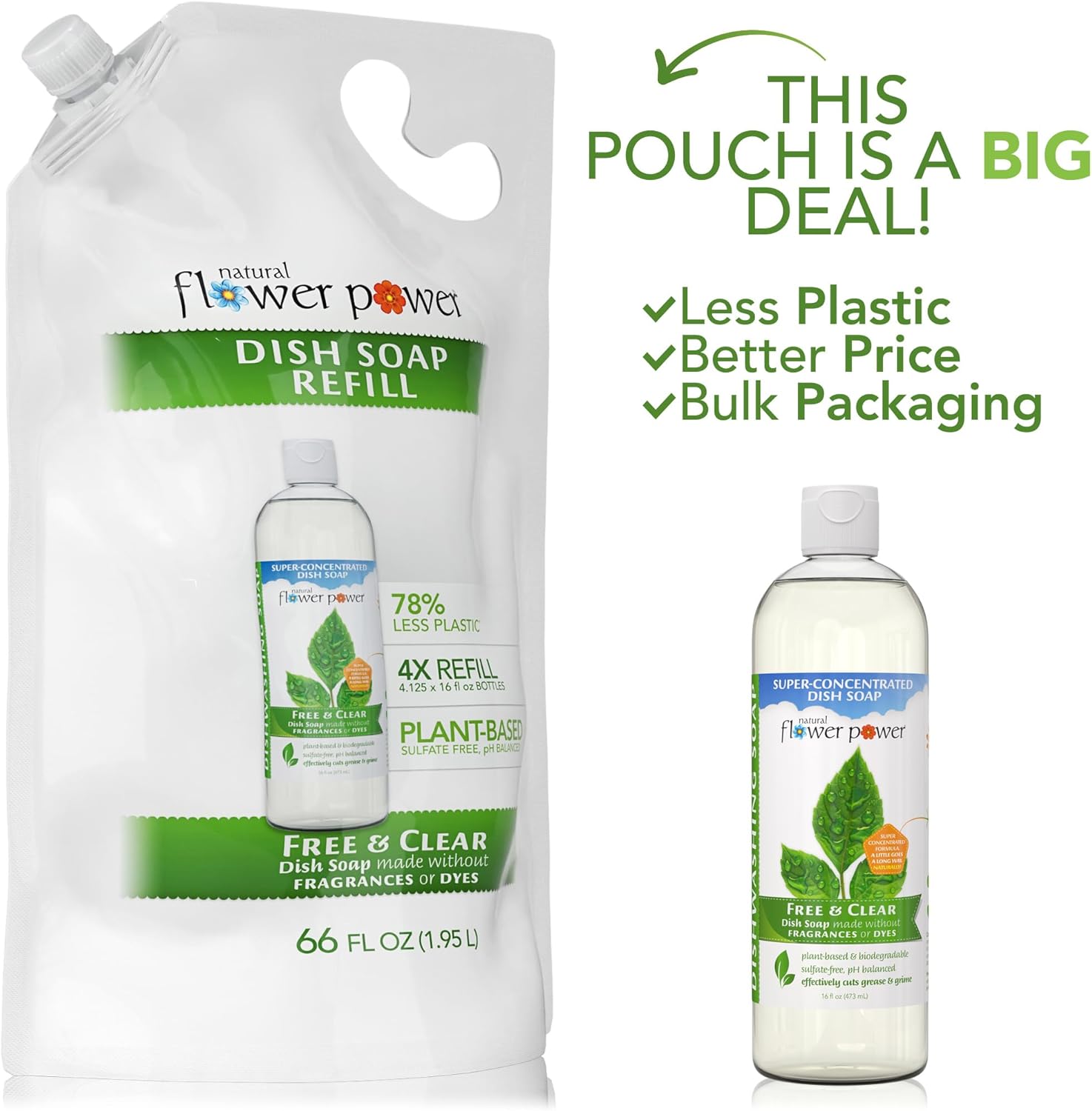 - REFILLS 4X – These 66 fluid ounce refills will refill the 16 fluid ounce bottles 4 times! Our refills use 78% less plastic and are economical for the earth and your wallet. Natural Flower Power Dish Soap Bottles are 16 fluid ounces and come with convenient flip-top lids that will not clog. Available in 5 scents: Citrus & Spice, Lavender, Lemongrass, Peppermint & Lemon, and Free & Clear (Unscented).