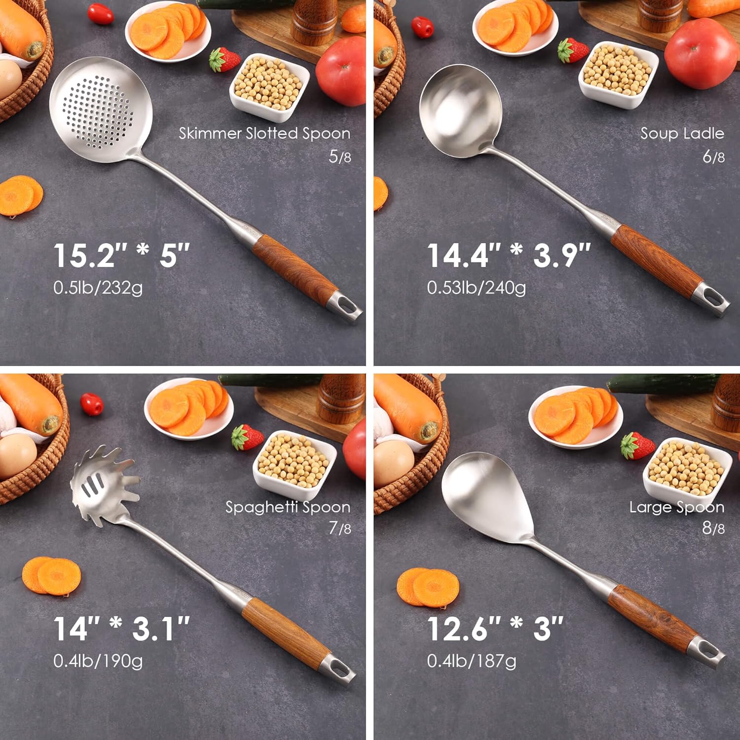 - 【Versatile Laege Spoons Set】: 8pcs - 1 slotted spatula turner, 1 spatula, 1 solid serving spoon, 1 slotted serving spoon, 1 skimmer slotted spoon, 1 large spoon, 1 spaghetti spoon server, 1 soup ladle. And they pair perfectly with stainless or carbon steel cookware - these metal utensils are safe to use for cooking any type of food. For long hours of pleasure while you prepping, cooking, grilling, and serving