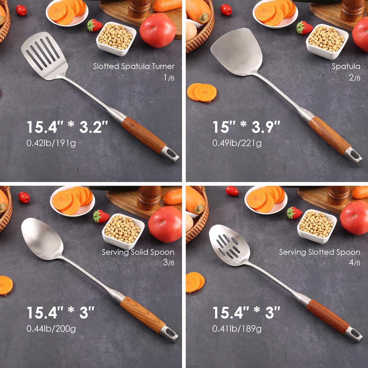 - 【High Quality Kitchen Utensils Set of 8】: Made of restaurant-quality 18/10 stainless steel(Highest grade in 304) and rosewood. Forged in one-piece, sturdy and durable. Fine matte brushed, unique shape and style, add a beautiful scenery to your kitchen