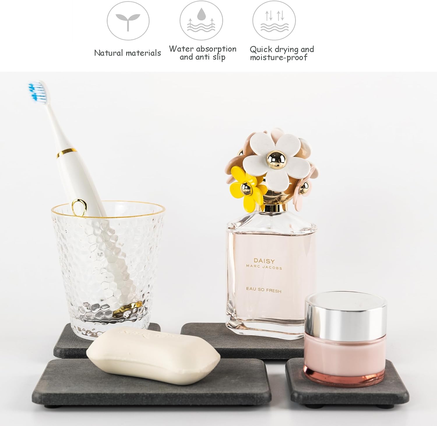 - Silicone footpads boost the slip-resistance of coasters while keeping them out of the bathroom vanity. This design improves the contact surface between the diatomaceous earth coaster and the air, accelerate moisture evaporation, and prolongs the service life of the product.