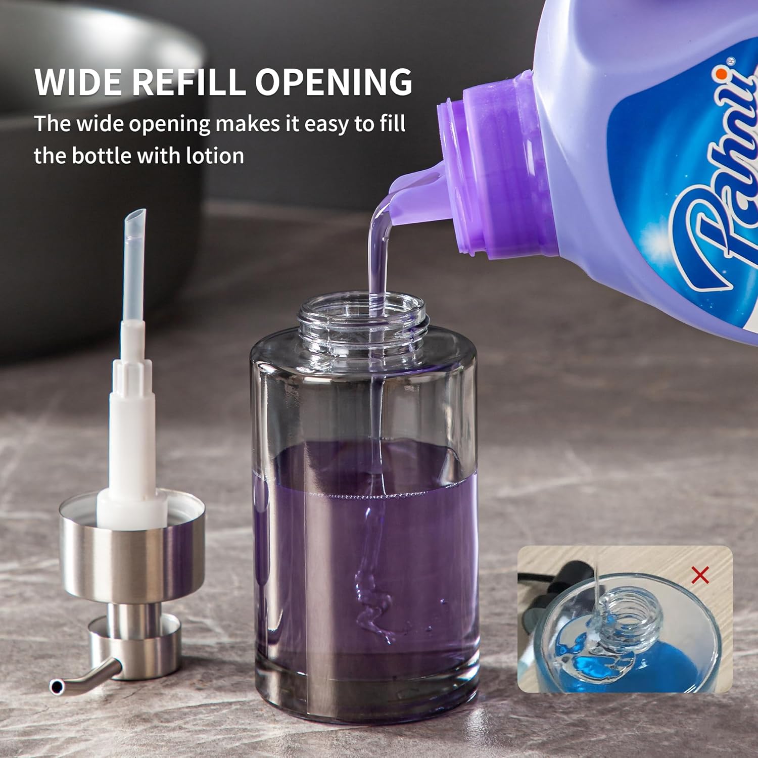 - Hand Glass Soap Dispenser: Our soap dispenser bathroom is made from Premium thick glass with a rust-resistant 304 stainless steel pump. It's lead-free, reusable and has a wide-mouth design for easy soap refilling.